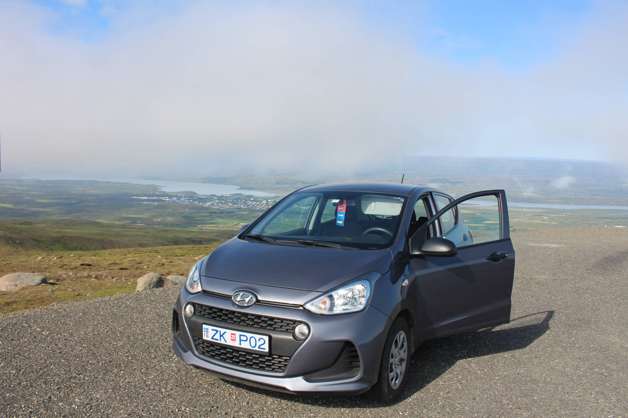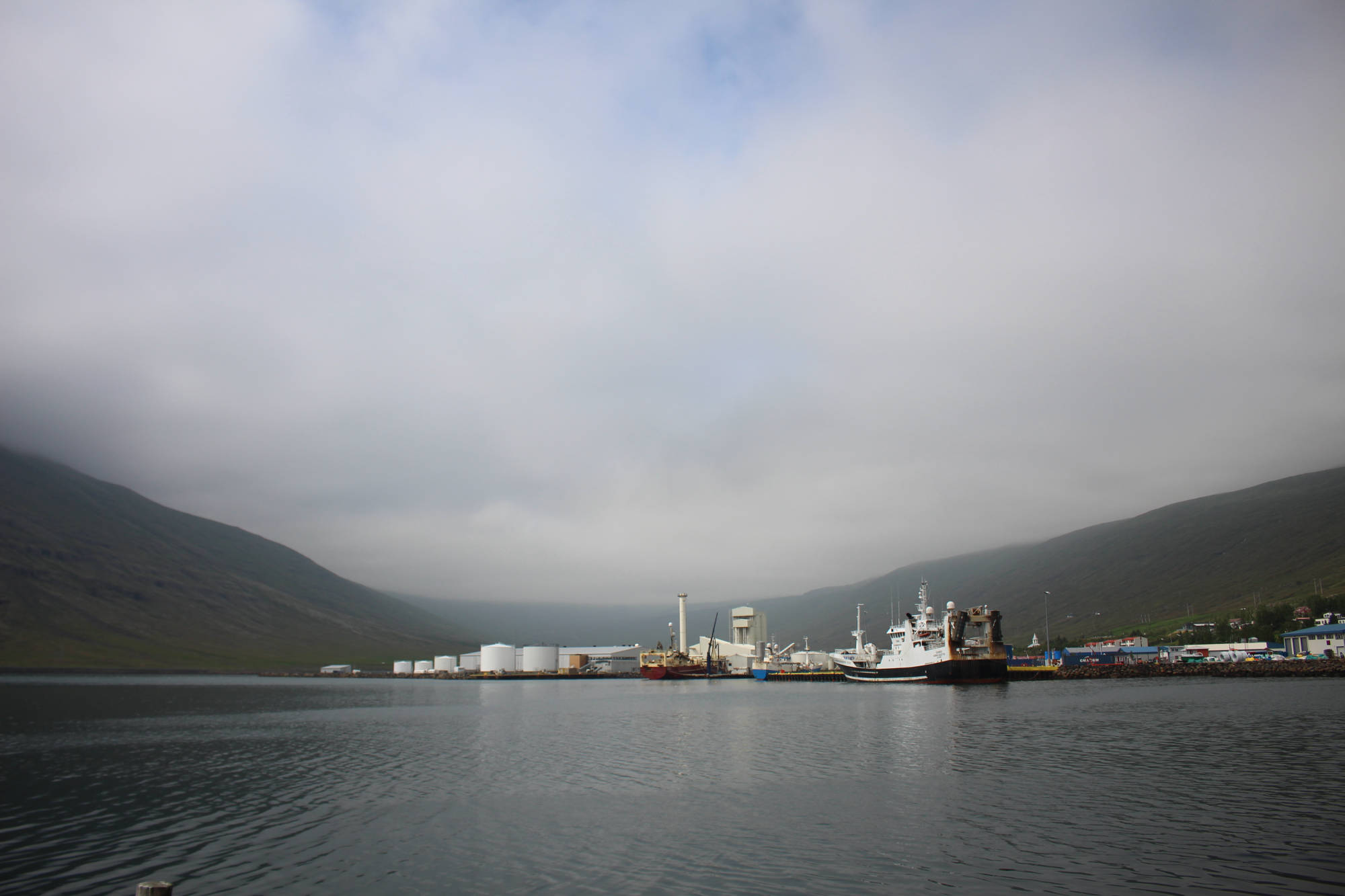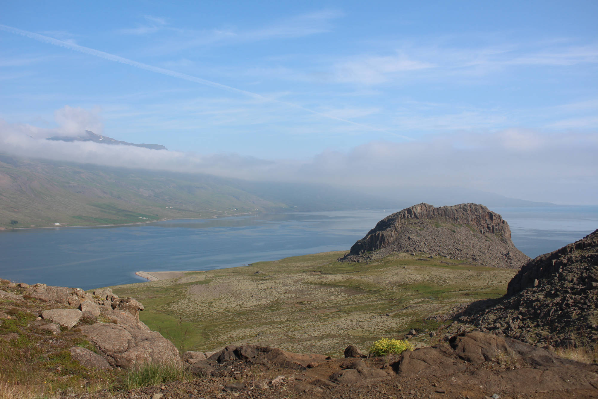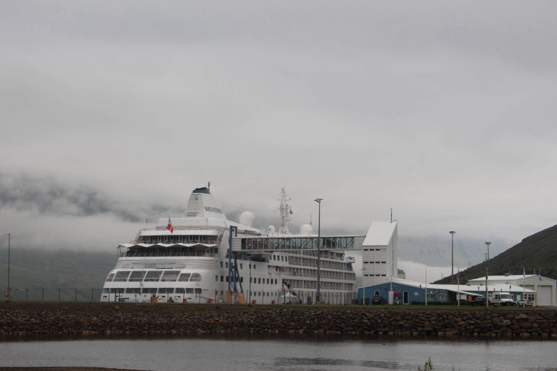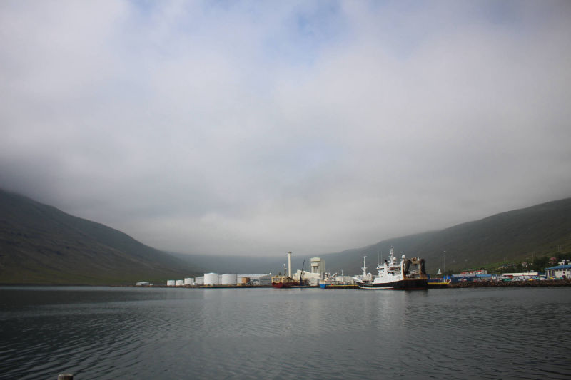 Gut gelaunt und voller Vorfreude, mich heute einmal motorisiert fortzubewegen, fuhr ich mit dem Fahrrad und all meinem Gepäck zum Autoverleih. Die organisatorischen Dinge waren ziemlich schnell erledigt und die Frau des Autoverleihs wünschte mir noch viel Glück dabei, Rentiere zu entdecken, denn davon gibt es in dieser Gegend eine Menge. Ich packte all mein Hab und Gut ins Auto, ließ mein Fahrrad angeschlossen zurück und bog gegen 9.30 Uhr auf die Straße Richtung Seyðisfjörður ein. Auf dem Weg dorthin machte ich einen Zwischenstopp, um den Wasserfall Fardagafoss zu besichtigen. Dafür war eine kleine Wanderung von 30 Minuten auf einen Berg notwendig, aber es waren noch andere Frühaufsteher unterwegs und so war ich auf diesem Spaziergang nicht allein. Kurz darauf setzte ich meinen Weg nach Seyðisfjörður fort und dieser führte mich auf einen hohen Berg mit einem herrlichen Ausblick auf das noch im Nebel eingehüllte Egilsstaðir. Die Fahrt über diesen Höhenzug gestaltete sich abenteuerlicher, als zu Beginn angenommen. Je höher ich kam, desto mehr Nebel umgab mich und desto schlechter wurde die Sicht. Doch ich kannte diese Situation schon von der Tour mit Meta und reduzierte meine Geschwindigkeit. Schon bald war ich dem Nebelfeld entwichen und Seyðisfjörður lag vor mir. Dieser Ort wirkte durch seine vielen kleinen bunten Häuser beinahe spielerisch. Gleichzeitig legt in diesem Hafen die einzige Autofähre an, die Island mit dem europäischen Festland verbindet.