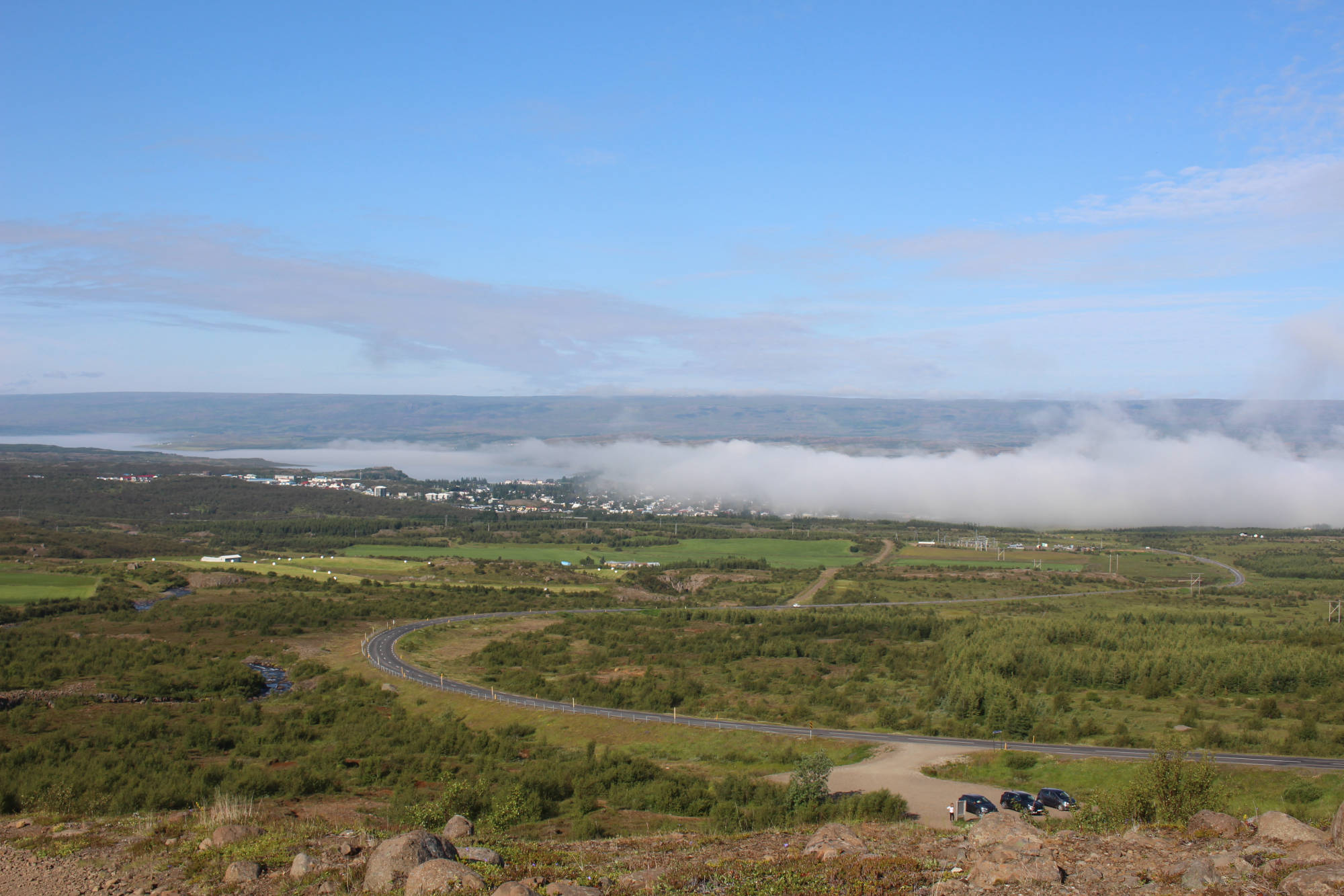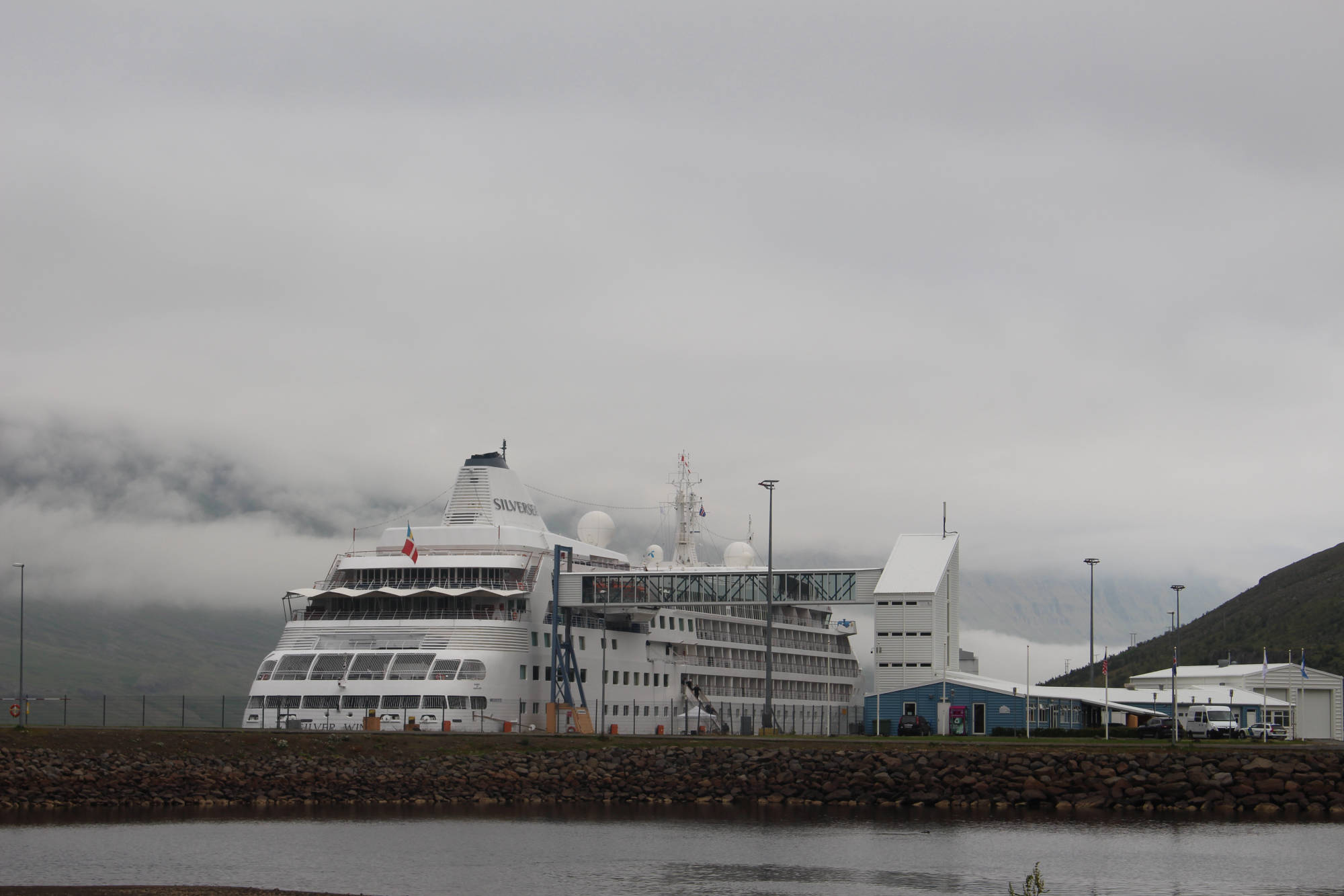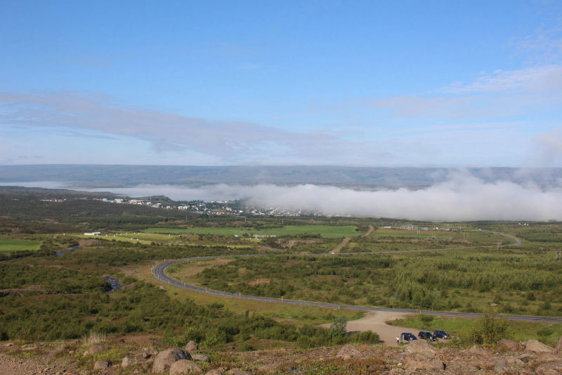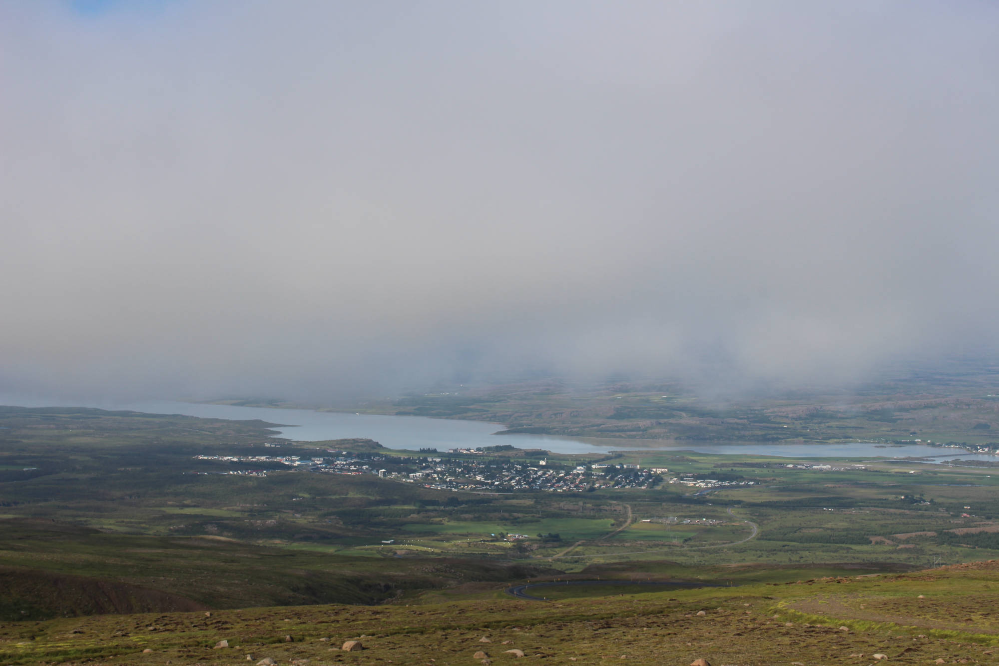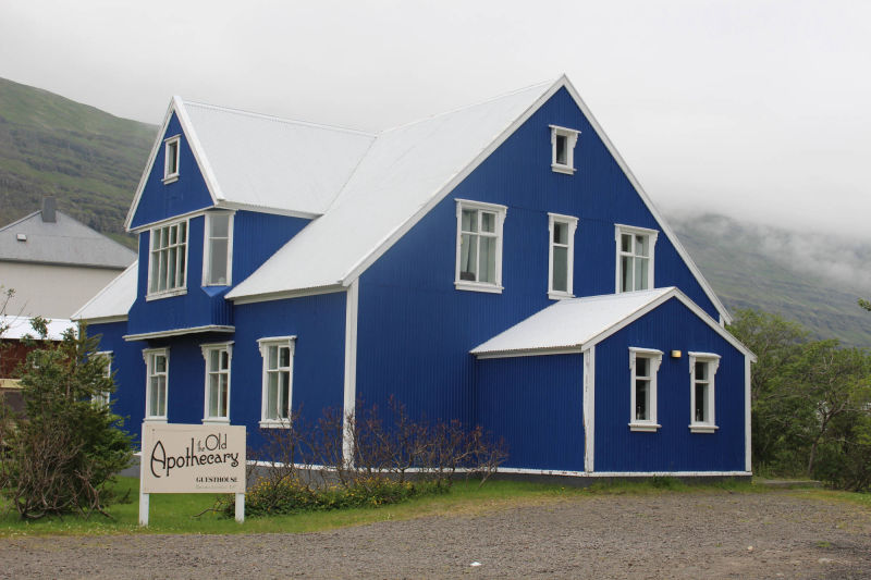 Gut gelaunt und voller Vorfreude, mich heute einmal motorisiert fortzubewegen, fuhr ich mit dem Fahrrad und all meinem Gepäck zum Autoverleih. Die organisatorischen Dinge waren ziemlich schnell erledigt und die Frau des Autoverleihs wünschte mir noch viel Glück dabei, Rentiere zu entdecken, denn davon gibt es in dieser Gegend eine Menge. Ich packte all mein Hab und Gut ins Auto, ließ mein Fahrrad angeschlossen zurück und bog gegen 9.30 Uhr auf die Straße Richtung Seyðisfjörður ein. Auf dem Weg dorthin machte ich einen Zwischenstopp, um den Wasserfall Fardagafoss zu besichtigen. Dafür war eine kleine Wanderung von 30 Minuten auf einen Berg notwendig, aber es waren noch andere Frühaufsteher unterwegs und so war ich auf diesem Spaziergang nicht allein. Kurz darauf setzte ich meinen Weg nach Seyðisfjörður fort und dieser führte mich auf einen hohen Berg mit einem herrlichen Ausblick auf das noch im Nebel eingehüllte Egilsstaðir. Die Fahrt über diesen Höhenzug gestaltete sich abenteuerlicher, als zu Beginn angenommen. Je höher ich kam, desto mehr Nebel umgab mich und desto schlechter wurde die Sicht. Doch ich kannte diese Situation schon von der Tour mit Meta und reduzierte meine Geschwindigkeit. Schon bald war ich dem Nebelfeld entwichen und Seyðisfjörður lag vor mir. Dieser Ort wirkte durch seine vielen kleinen bunten Häuser beinahe spielerisch. Gleichzeitig legt in diesem Hafen die einzige Autofähre an, die Island mit dem europäischen Festland verbindet.