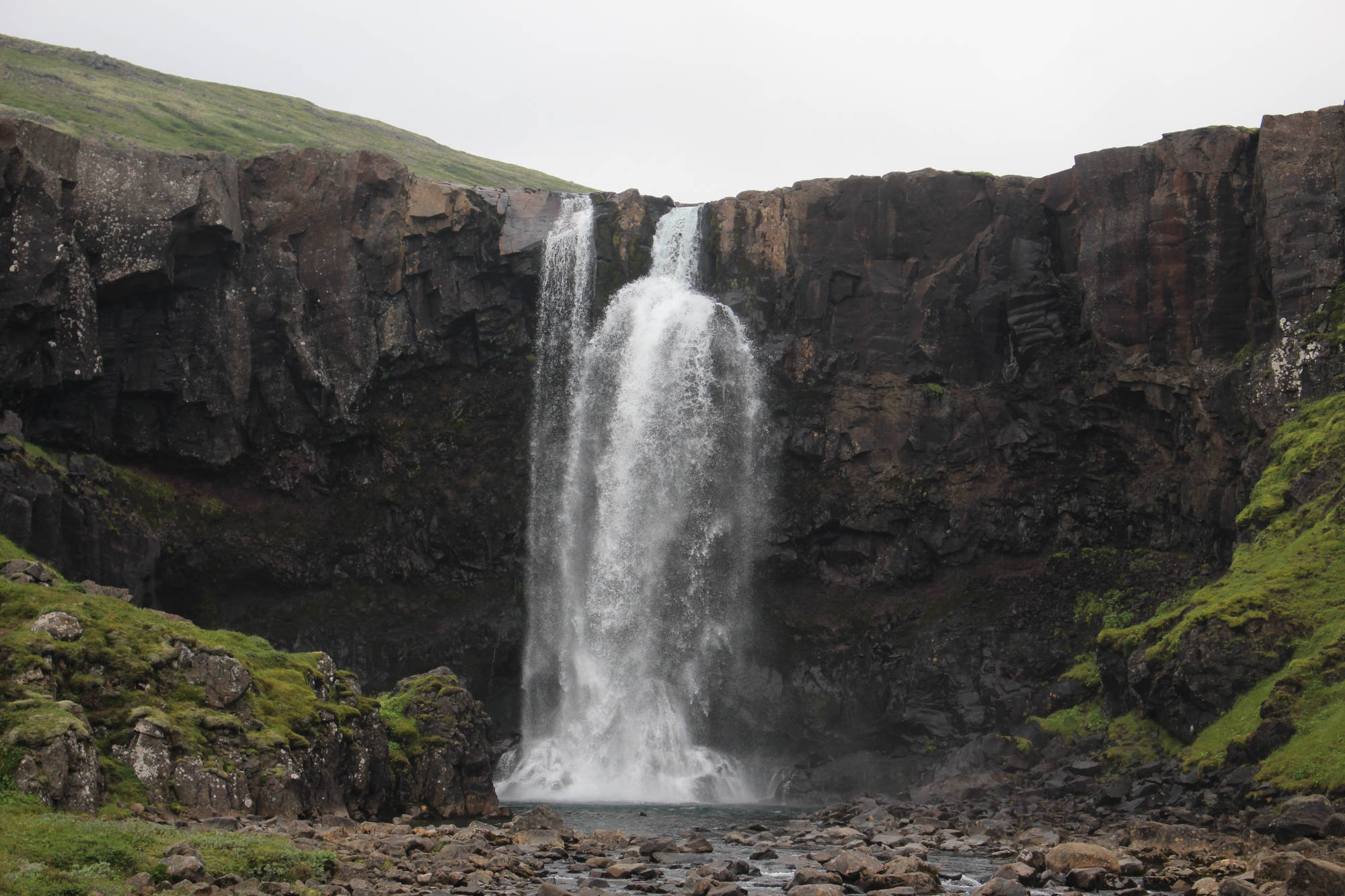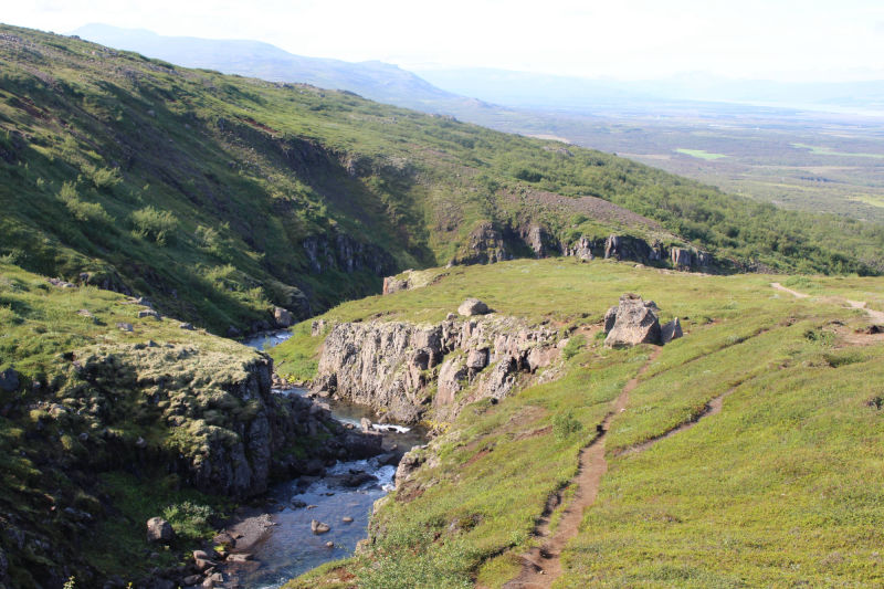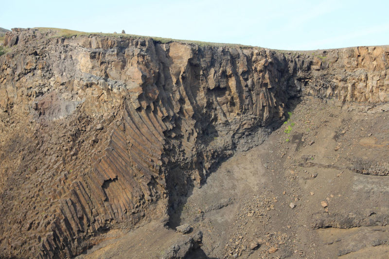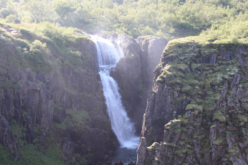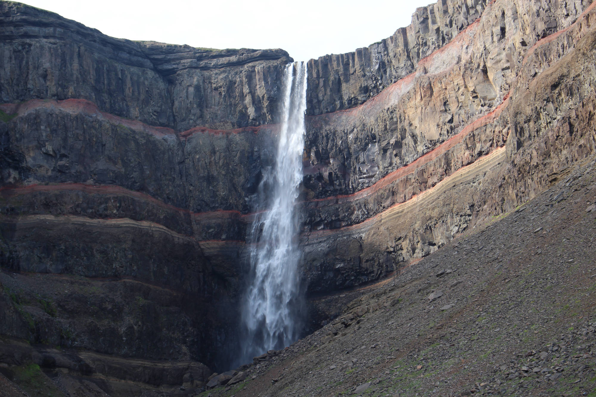 Danach verfolgte ich den Plan, den See Lagarfljót einmal zu umrunden, denn auf der anderen Seite gab es noch Islands dritthöchsten Wasserfall zu entdecken. Während der Wanderung dorthin, kam ich mit einem gebürtigen Schweden ins Gespräch, der jetzt in Dänemark lebt. Wir unterhielten uns über die "Faszination Island" und so kam uns der Weg bis nach oben nur noch halb so lang vor. Unmittelbar neben dem Wanderweg blickte man in die Tiefe der schönen Schlucht, die der Fluss Hengifossá geformt hatte. Ab und zu konnte man die besonderen Basaltsäulen entdecken. Ich hatte das Gefühl die Dinge auf den Informationstafeln schon einmal in der Schule gelernt zu haben. Hätte ich damals diesen Anblick genießen können, dann wüsste ich das Gelernte vielleicht heute noch... Die Basaltsäulen entstehen auf jeden Fall, wenn die Lava weiter abkühlt. Dann formt sich das abkühlende Gestein zu Säulen, die in der Regel sechseckig sind. Oben angekommen, konnte ich den knapp 130 Meter hohen Wasserfall bestaunen. Zwischen den dunklen Basaltschichten sind auch rötliche Lehmschichten zu erkennen. Diese entstanden, als Vulkanasche auf die Lavaschichten fielen und mit der Zeit zu Lehm mit Eisenverbindungen wurde. Als das Eisen sich mit Sauerstoff verband, färbte es sich rot. Nach dieser Besichtigung wollte ich so langsam auf den Campingplatz zurückkehren.