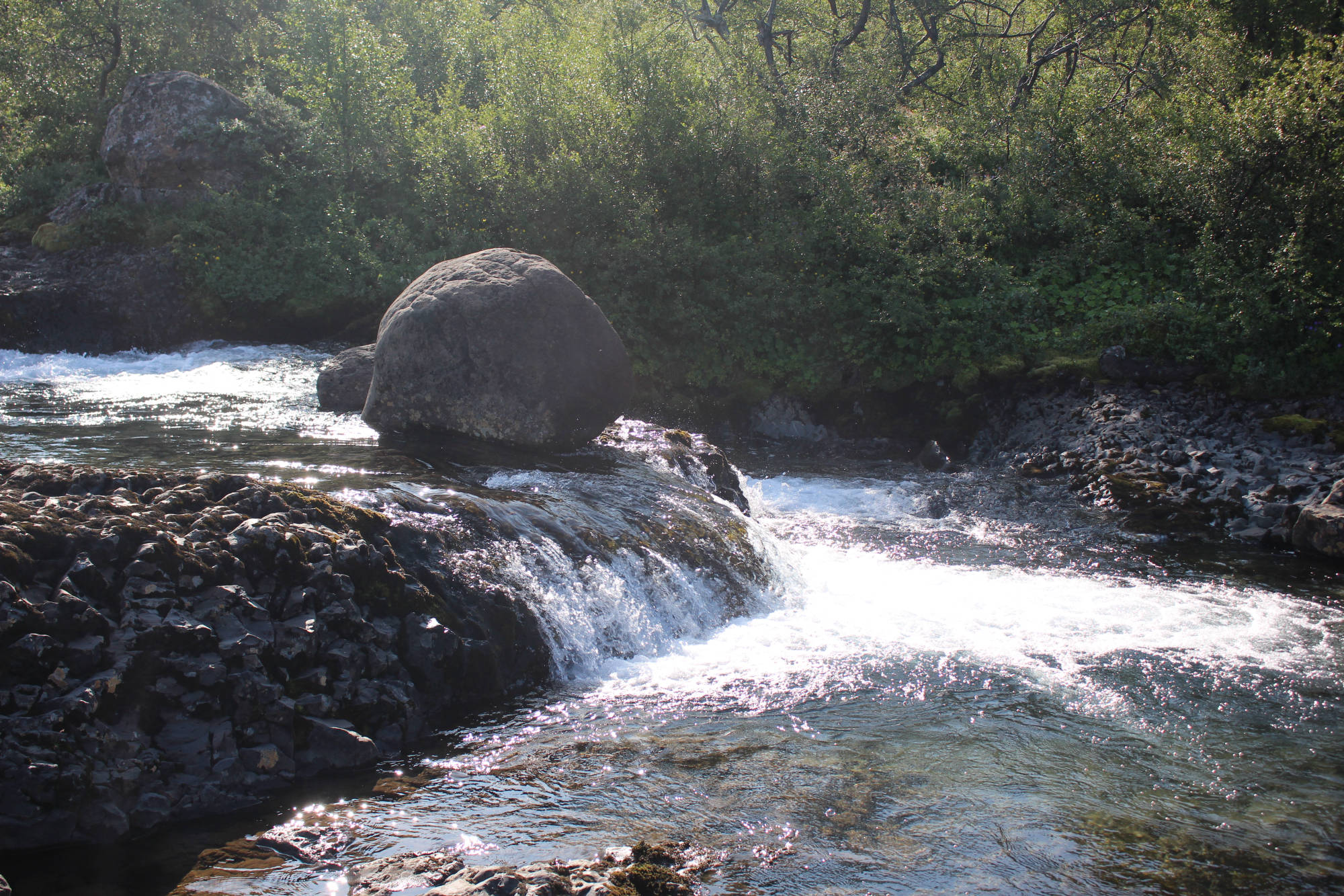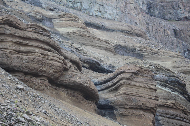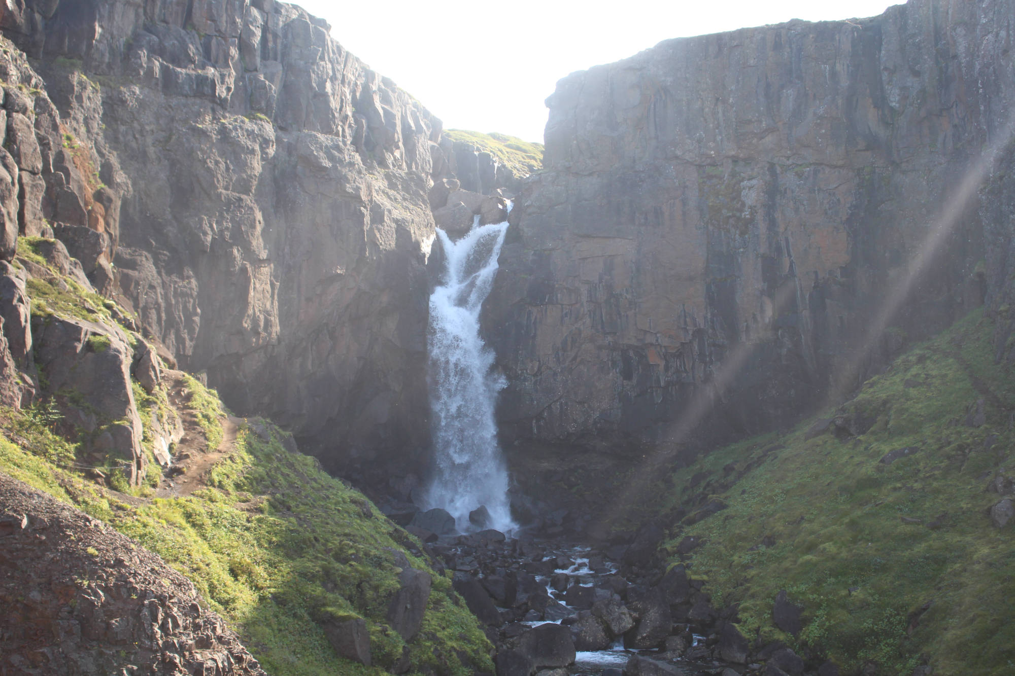 Danach verfolgte ich den Plan, den See Lagarfljót einmal zu umrunden, denn auf der anderen Seite gab es noch Islands dritthöchsten Wasserfall zu entdecken. Während der Wanderung dorthin, kam ich mit einem gebürtigen Schweden ins Gespräch, der jetzt in Dänemark lebt. Wir unterhielten uns über die "Faszination Island" und so kam uns der Weg bis nach oben nur noch halb so lang vor. Unmittelbar neben dem Wanderweg blickte man in die Tiefe der schönen Schlucht, die der Fluss Hengifossá geformt hatte. Ab und zu konnte man die besonderen Basaltsäulen entdecken. Ich hatte das Gefühl die Dinge auf den Informationstafeln schon einmal in der Schule gelernt zu haben. Hätte ich damals diesen Anblick genießen können, dann wüsste ich das Gelernte vielleicht heute noch... Die Basaltsäulen entstehen auf jeden Fall, wenn die Lava weiter abkühlt. Dann formt sich das abkühlende Gestein zu Säulen, die in der Regel sechseckig sind. Oben angekommen, konnte ich den knapp 130 Meter hohen Wasserfall bestaunen. Zwischen den dunklen Basaltschichten sind auch rötliche Lehmschichten zu erkennen. Diese entstanden, als Vulkanasche auf die Lavaschichten fielen und mit der Zeit zu Lehm mit Eisenverbindungen wurde. Als das Eisen sich mit Sauerstoff verband, färbte es sich rot. Nach dieser Besichtigung wollte ich so langsam auf den Campingplatz zurückkehren.