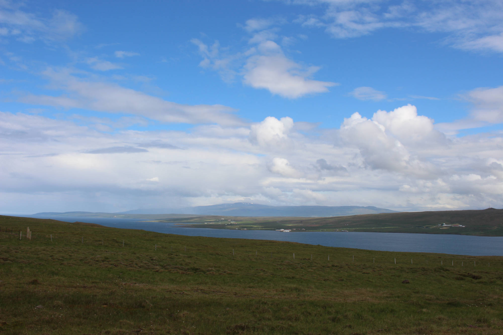 Nach einigen Stunden auf der 59 lag dann endlich der erwartete Fjord vor mir - Hrútafjörður. Zwischenzeitlich hatte die Sonne den Kampf gegen die Wolken gewonnen und das Wasser schimmerte wunderschön blau. Ich sollte mich mittlerweile an die tägliche Faszination für die Landschaften Islands gewöhnt haben, aber die Natur war immer wieder unglaublich beeindruckend für mich. Leider kann man die Schönheit des Fjordes nicht gänzlich auf Bildern wiedergeben. Mein Minimalziel hatte ich dann doch relativ schnell erreicht. 14.00 Uhr war ich am kleinen Hafen in Borðeyri, der auch einen Campingplatz zu bieten hatte. Doch, dass ich auf der anderen Seite des Fjordes mein Maximalziel sehen konnte, spornte mich schließlich doch irgendwie an, noch weiterzufahren.