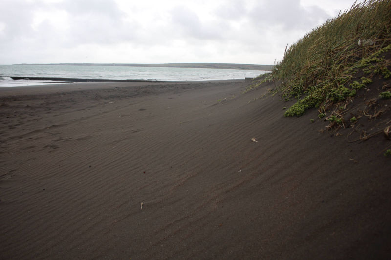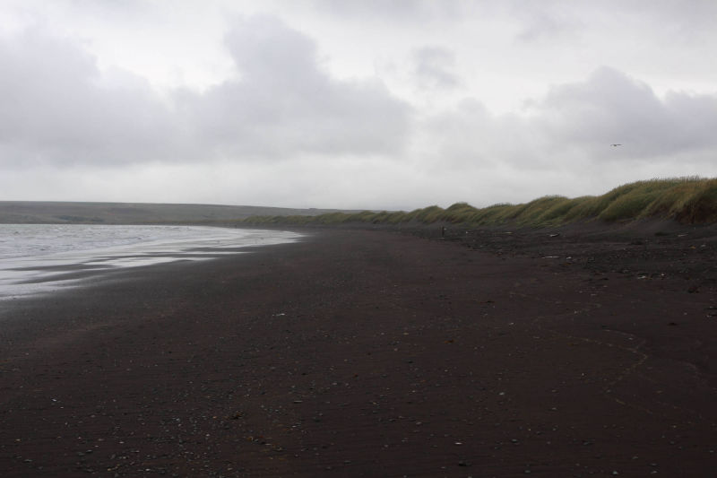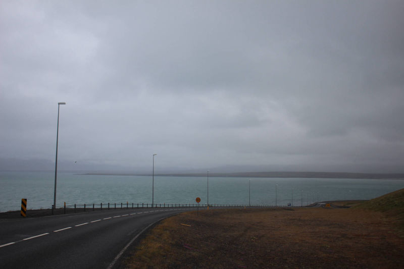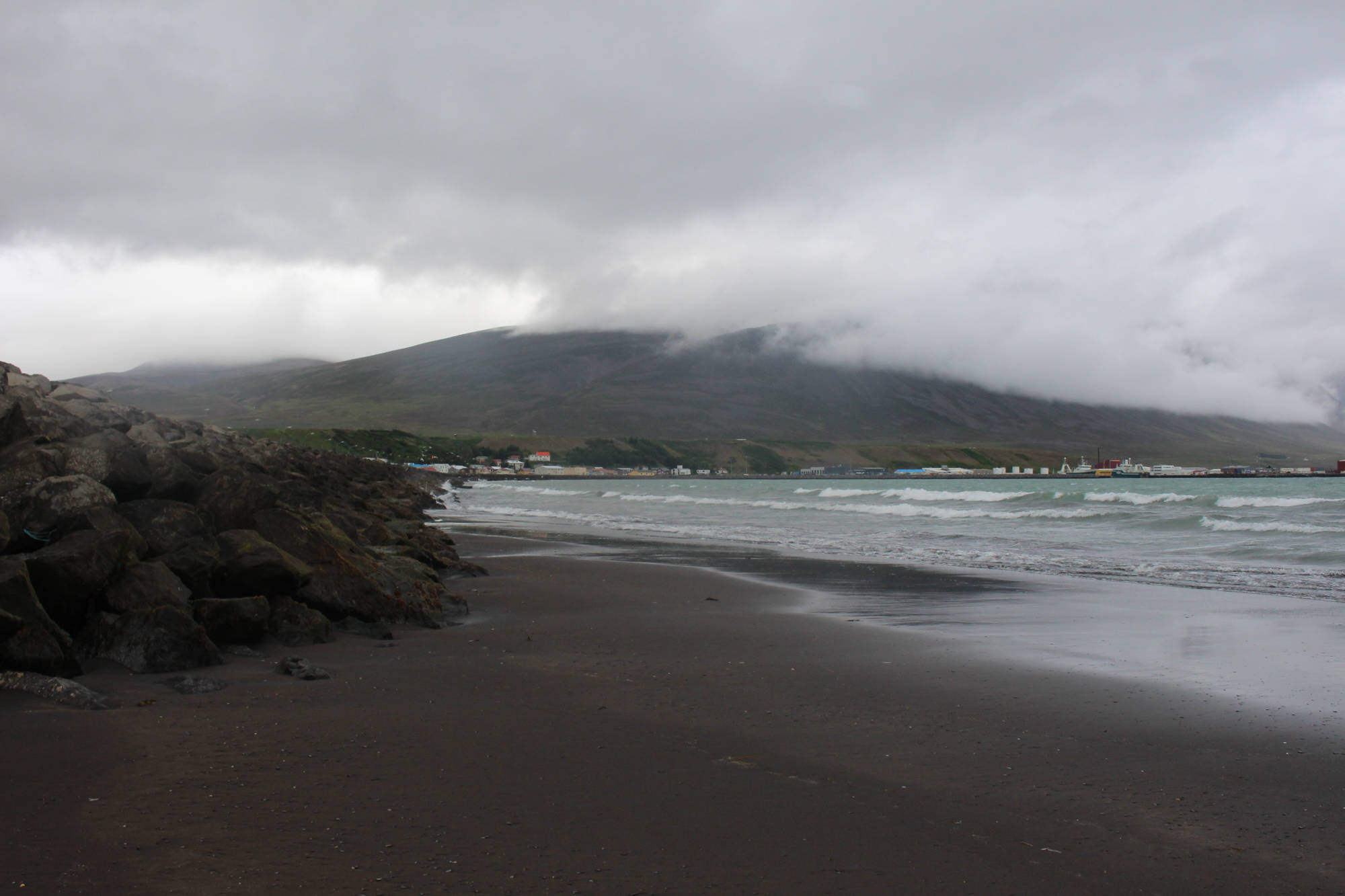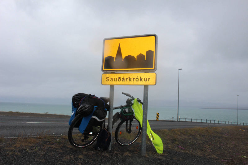 Der Plan ging ziemlich gut auf. Nach einiger Zeit war ich schon ziemlich weit oben und bemerkte, dass es wirklich kalt geworden war. Das Schild im Tal hatte eine Temperatur von 4 °C auf dem Berg vorausgesagt und das bekam ich zu spüren. Ich konnte keine langen Pausen machen. Bewegung erzeugt Wärme. Das ging auch ganz gut, bis ich oben war. Als ich dann die Abfahrt genießen wollte, zog ich fast alles an, was ich so dabei hatte. Ich sah zwar aus wie ein Eskimo, aber ich fror nicht mehr. Nachdem ich den Þverárfjall also hinter mir gelassen hatte, waren die Wege relativ flach und vor allem (...was ein weiterer Vorteil dieses Umweges war) nicht so befahren, wie die Ringstraße. Ich genoss also die Gesellschaft der vielen Islandschafe am Wegesrand und kam mit dem "Mamma Mia"-Soundtrack auf den Ohren auch ziemlich schnell in Sauðárkrókur an. Dort stellte ich mein Zelt auf und kroch eine Weile in den Schlafsack, um mich aufzuwärmen. Ich hatte nicht gemerkt, wie kalt mir wirklich war. Nach ca. 2 Stunden fühlten sich alle Extremitäten wieder warm und lebensfähig an. Ich war bereit, mir Sauðárkrókur ein bisschen näher anzusehen. Also rauf aufs Fahrrad und los... oder auch nicht. Mein Hinterreifen war platt. Das Auswechseln ging ziemlich schnell - Ich hatte in Deutschland ja auch vom Besten gelernt... Nachdem ich meinen besten Kumpel geheilt hatte, fuhr ich zum örtlichen schwarzen Strand. Schon unglaublich, dass der Sand aus geraspeltem Lavagestein besteht...