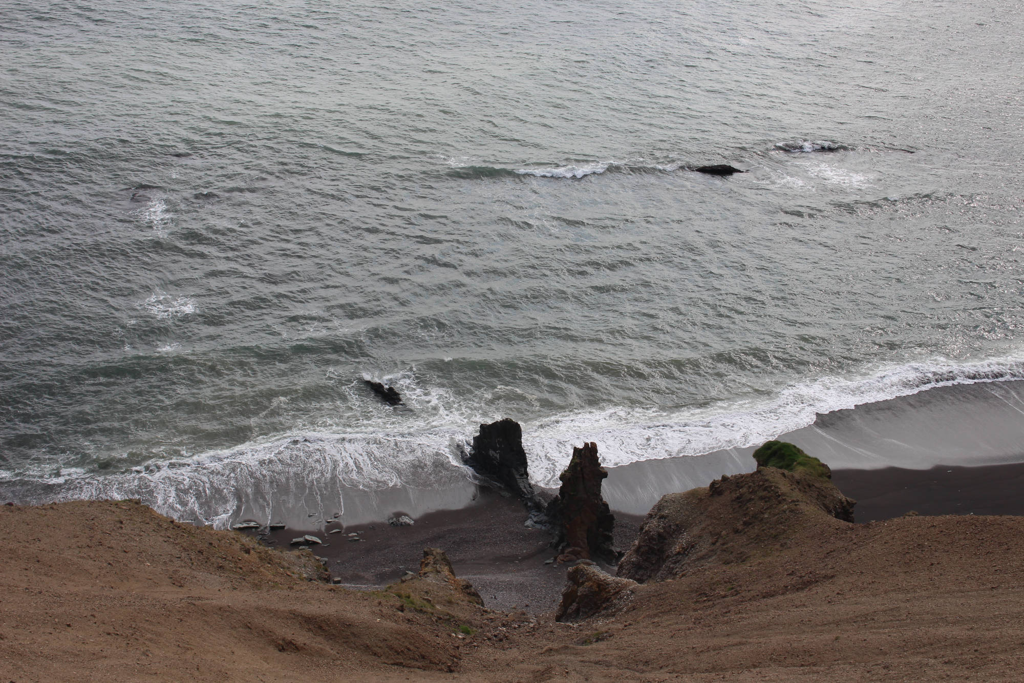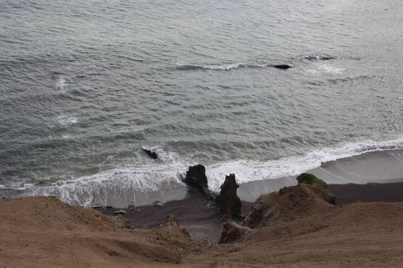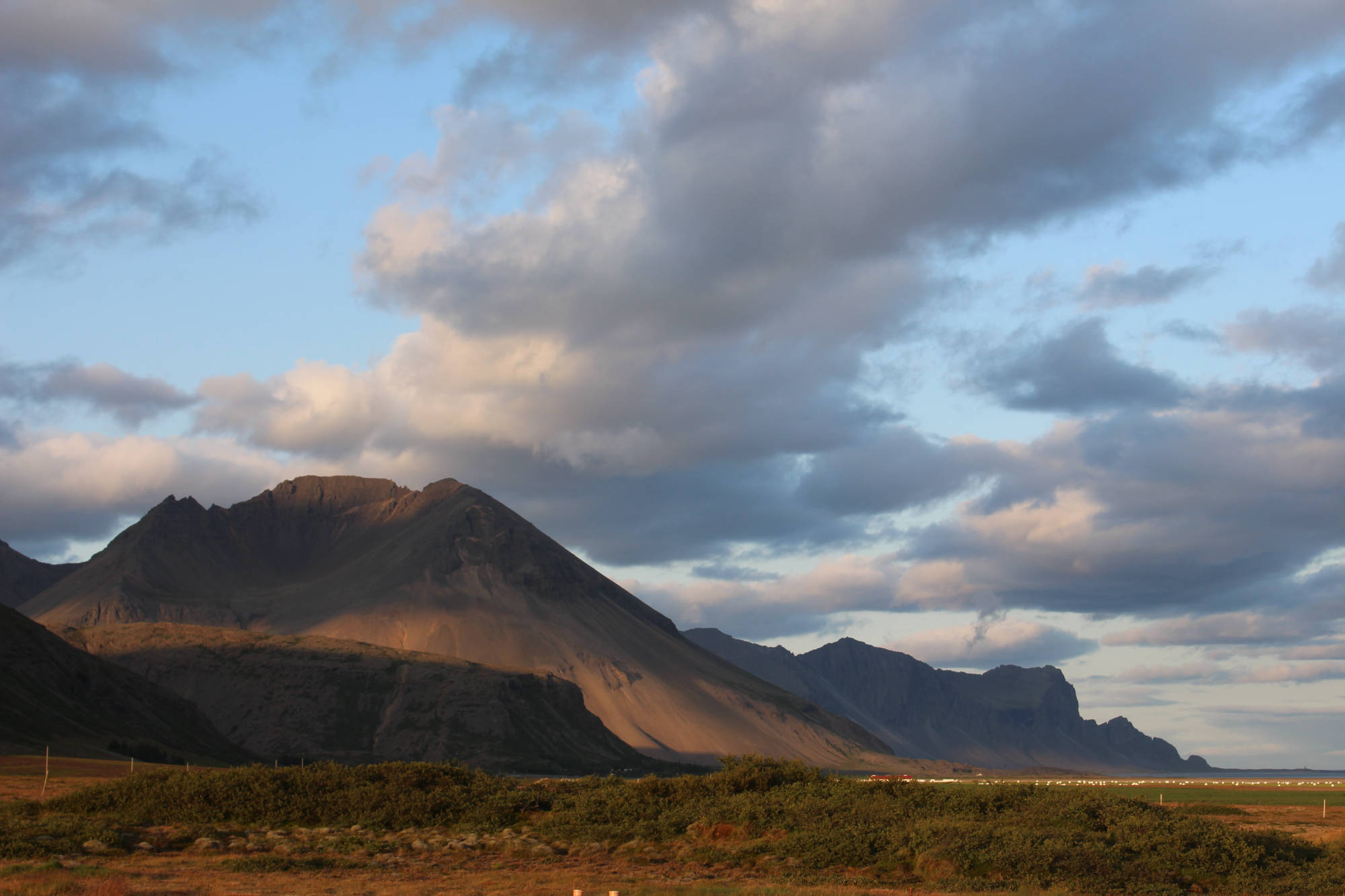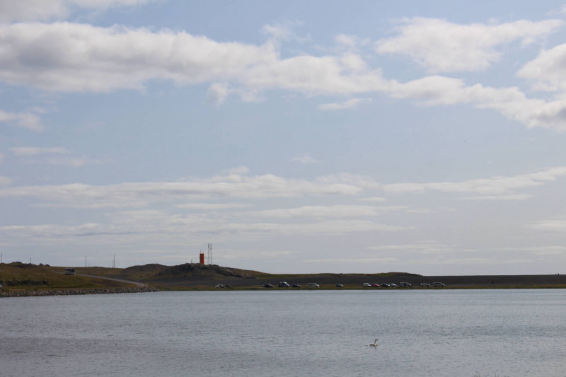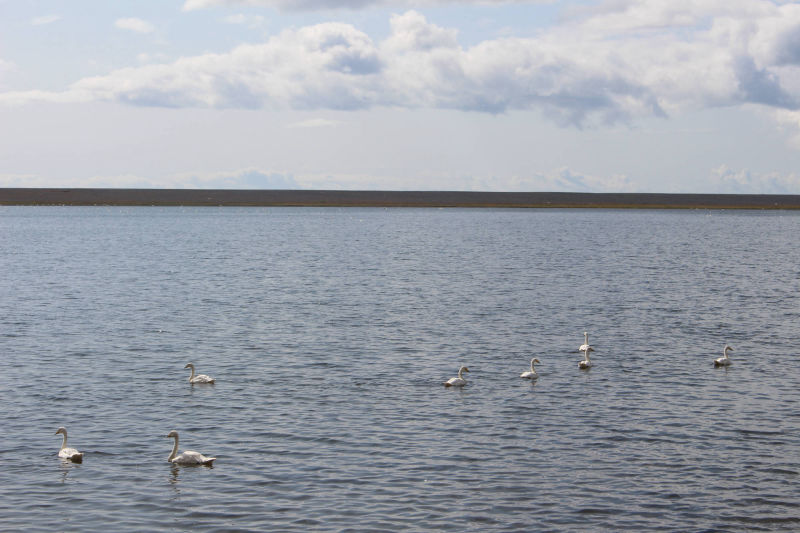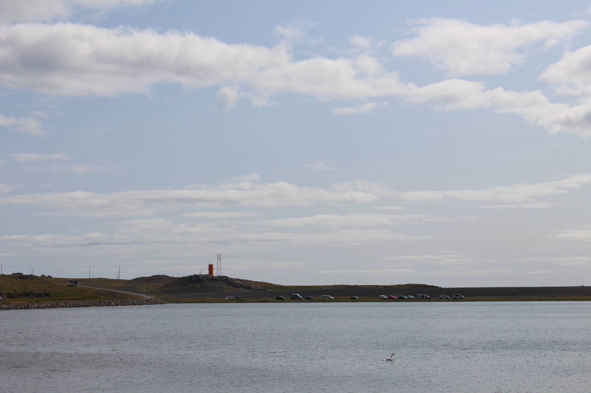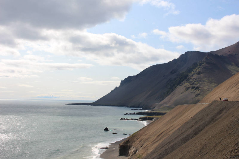 Die ersten Kilometer meines Weges führten mich wieder an einem der Ostfjorde entlang und wieder packte mich der Wind von allen Seiten. Aber diesmal war der Weg bis zur Spitze glücklicherweise nicht ganz so weit und nach einer Stunde war der Spuk vorbei. Nach dieser weiteren Fjorderfahrung folgte nun ein Streckenabschnitt, der mich über einige Hügel führen sollte. Hierbei folgte einem steilen Anstieg immer gleich eine genauso steile Abfahrt. Das ständige Auf und Ab schulte mich darin, den perfekten Moment abzupassen, in die Pedale zu treten, um den optimalen Nutzen aus der Abfahrt zu ziehen und den folgenden Anstieg möglichst weit hochzurollen. Aller 10 Kilometer legte ich einen kurzen Halt ein und so hatte ich bald offiziell Südisland erreicht. Petra, die Steinsammlerin, war mit Recht von der Wandelbarkeit der Natur fasziniert. Wo konnte man das auch besser sein, als hier in Island, wo sich die verschiedensten Landschaftsbilder aneinanderreihen. Nachdem sich die letzten Tage hauptsächlich Wiese und sumpfige Landschaft vor dem Meer befunden hatten, genoss ich jetzt den herrlichen Blick auf das Meer und die Küste mit schwarzem Sandstrand. Nicht viel weiter im Landesinneren erhoben sich wieder die riesigen Berge, von denen es hier so viele gibt. Dann tat sich mir der Ausblick auf meinen weiteren Weg auf. Direkt am Berg entlang schlängelte sich eine schmale Küstenstraße, auf der verhältnismäßig viele Autos unterwegs waren. Es war nicht ganz einfach an einer viel befahrenen Straße zu schieben, aber letztendlich lohnte es sich, denn auf einer Anhöhe war der Ausblick wunderschön. Mittlerweile hatte ich entschieden, die Strecke bis zum nächsten Campingplatz durchzuziehen. Je weiter ich fuhr, desto mehr veränderte sich die Natur um mich. Auffällig war, dass mich auf einmal eine enorme Menge an Vögeln umgab. Besonders die grazilen Schwäne, auf den kleinen Seen neben der Straße waren in großer Anzahl versammelt.