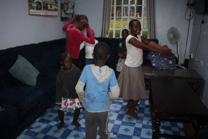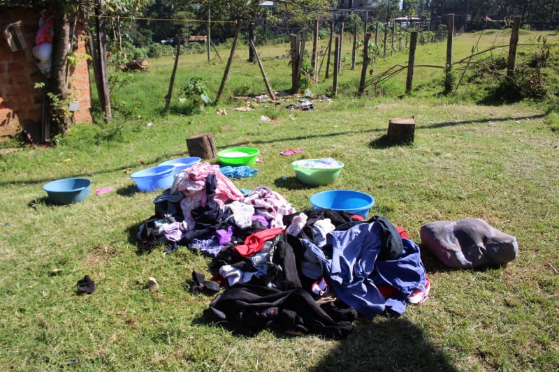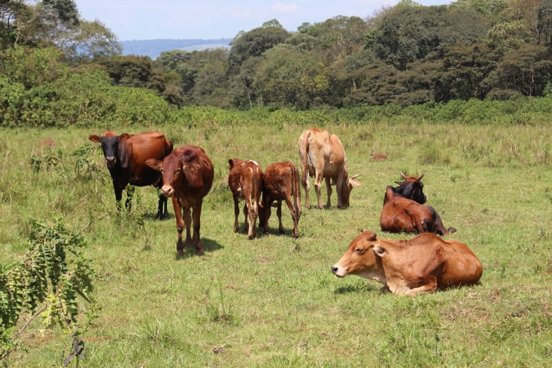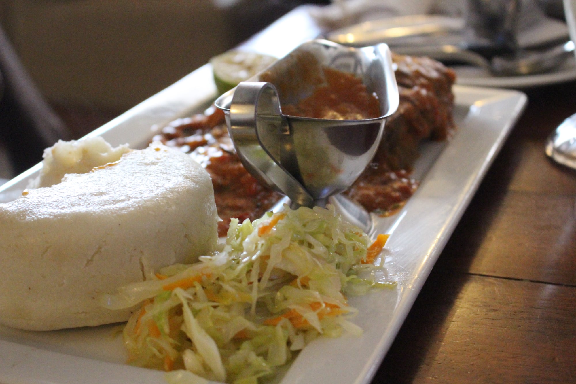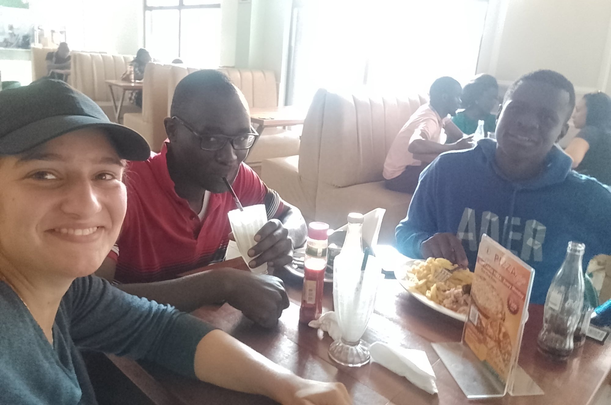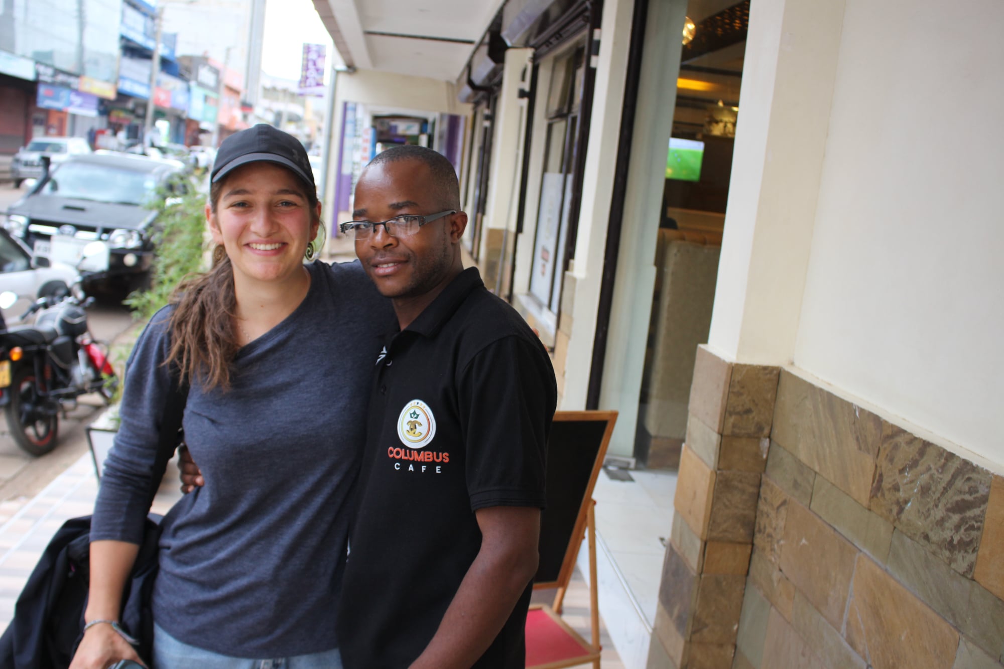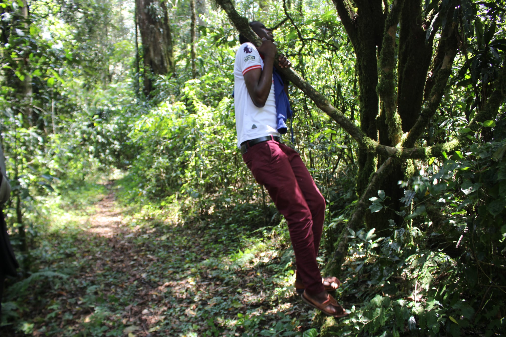 Nach etwa einer halbstündigen Wanderung durch den dichten Wald erreichten wir auf einmal eine große Lichtung. Diese würde man wohl eher als Weide bezeichnen, weil uns dort eine Herde Kühe begrüßte. Die Mittagssonne, die vorher von den hohen Bäumen abgeschirmt wurde, zeigte nun ihre volle Wirkung. Am Abend sollte ich feststellten, dass mir diese Lichtung meinen ersten kenianischen Sonnenbrand verschaffte. Neben den Kühen konnte man hier außerdem eine Menge Ameisenhaufen finden, die sich überall auf der Weide verteilten. Kurze Zeit später fanden wir uns im Wald wieder und unser Guide zeigte uns Lianen. Ophilo teste sofort, aber bis er sich so anmutig wie Tarzan durch die Lüfte schwingt, braucht es wohl noch die ein oder andere Übungsstunde. Im Gegensatz zu meinen Eindrücken aus dem Film war ich jedoch überrascht, wie unflexibel und holzig Lianen eigentlich sind. Neben solch spaßigen Erfahrungen, erfuhren wir auch von so einigen Heilmitteln, die hier im Wald natürlich wuchsen. Zuerst zeigte unser Guide uns eine Pflanze, die als Heilmittel für Prostatakrebs eingesetzt wird. Anschließend durften wir von einer anderen Pflanze kosten, die minzig schmeckte und bei Erkältungen eingesetzt wird. Fast 400 Vogelarten sind im Kakamega Regenwald zu Hause. Man kann sieben Affenarten beobachten, 170 verschiedene Blumen bewundern und 150 unterschiedliche Baumarten entdecken. Natürlich gibt es auch ein paar Schlangen und andere Amphibien, aber mit denen machten wir (zum Glück?) keine Bekanntschaft. Als ich unseren Guide fragte, ob es hier im Wald gefährlich werden kann, verneinte dieser. Die größte Gefahr, sind die Flüsse im Wald, die sich nach einem starken Regen zu reißenden Strömen entwickeln. Badeunfälle sind dann keine Seltenheit. Nach unserer Wanderung war es schon gegen 15.00 Uhr und wir bekamen so langsam Hunger. Wir entschieden nach Kakamega zu fahren und dort gemeinsam zu essen. Auf dem Weg nach Kakamega kamen wir an riesigen Teeplantagen vorbei. Im Cafè Columbus Club gab es dann Fisch für David (Er isst übrigens kein Fleisch, sondern nur Fisch. Da er von einer Insel stammt und mit Fisch groß geworden ist, hat er sich nie an den Geschmack von Fleisch gewöhnt.). Für Ophilo gab es Hühnchen und für mich eine köstliche vegetarische Pizza. Als wir vollkommen gesättigt den Heimweg antreten wollten, fragte mich der Kellner im Café noch, ob wir ein Foto zusammen machen könnten. Der Muzungu-Status zeigte mal wieder seine Wirkung. Obwohl es sich immer noch ein wenig komisch anfühlte, aufgrund meiner Hautfarbe, für die ich absolut nichts getan habe, wie ein Promi behandelt zu werden, hatte das Ganze zumindest etwas Gutes: Die Menschen waren anschließend glücklich.
