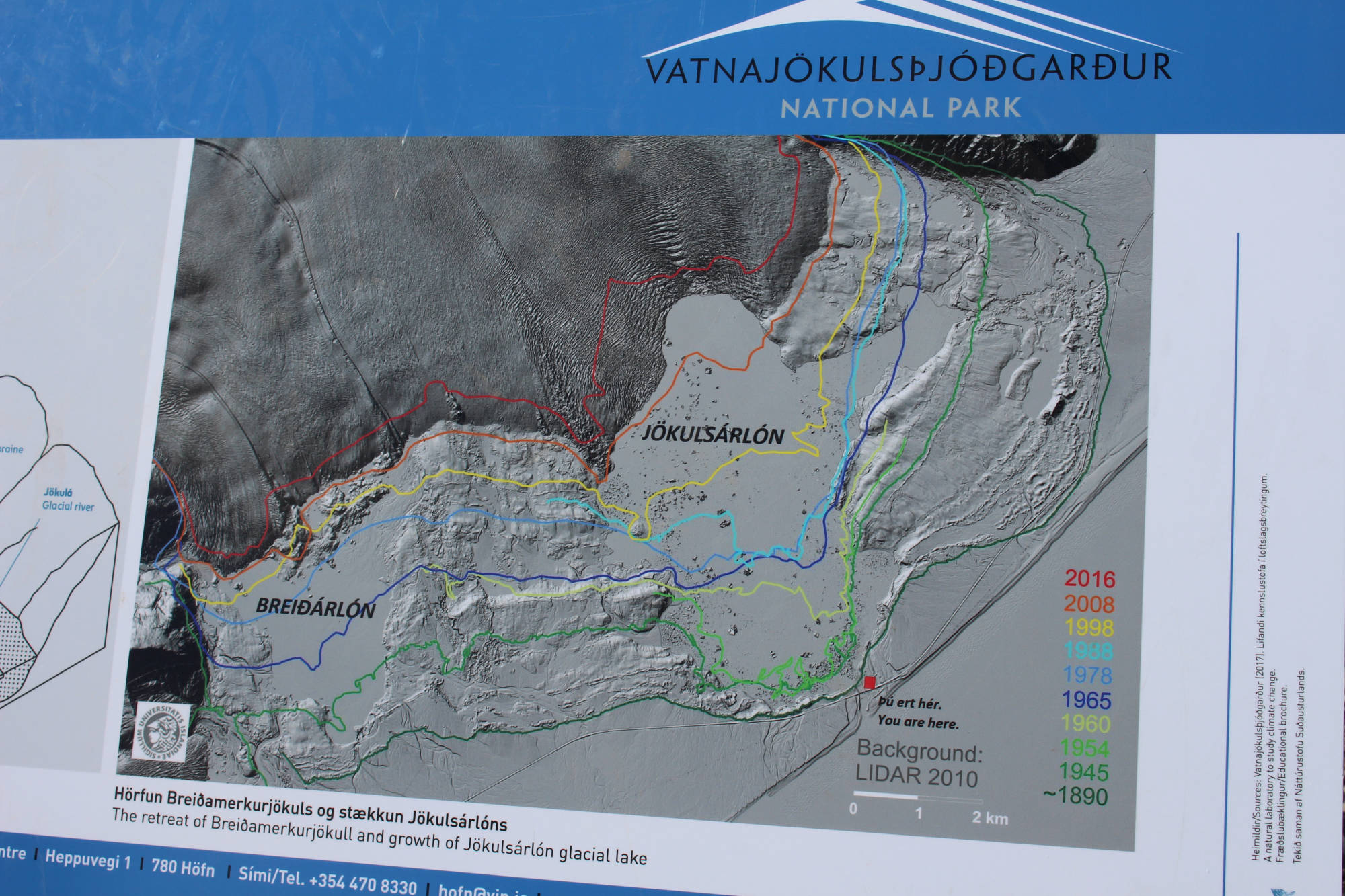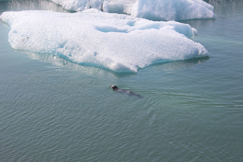 Geformt wird dieser See durch Schmelzwasser des Breiðamerkurjökull, einem Gletscherausläufer des Vatnajökull. Der Jökulsárlón ist in den letzten Jahrzehnten sehr schnell immer größer geworden. In den Siebziger Jahren hatte er noch eine Größe von rund 8 km², heute ist er mehr als doppelt so groß und bedeckt eine Fläche von ca. 18 km². An seiner breitesten Stelle ist er fünf Kilometer breit und der See hat eine Tiefe von 248 Metern. Damit ist er das tiefste Gewässer in Island. Auch die Tierwelt im und um den See ist bewundernswert. Immer wieder tauchten Robben zwischen den Eisbrocken auf und man bekam verschiedenste Vogelarten zu Gesicht. Beispielsweise die arktische Seeschwalbe, die in 1.5 Monaten 19.000 Kilometer geflogen ist, um hier zu nisten. Schilder weisen darauf hin, den Vögeln ihren Freiraum zu geben. Auch die Nonnengans, die große Raubmöwe oder die Eiderente sind hier zu Hause. Hat man Glück und gute Augen, kann man neben Vögeln auch Rentiere und Füchse entdecken. Leider habe ich trotz der vielen Warnschildern auf der Straße bisher auf meiner ganzen Reise kein Rentier zu Gesicht bekommen.