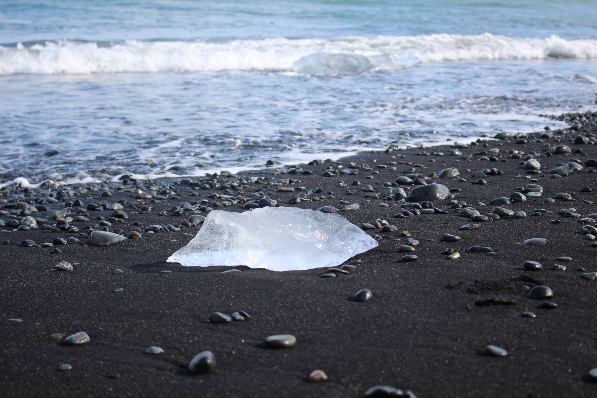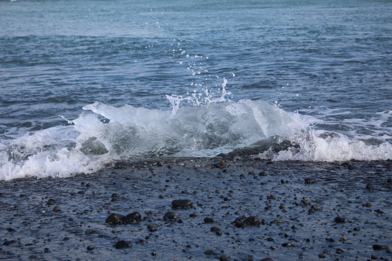 Über einen kurzen Fluss namens Jökulsá á Breiðamerkursandi ist die Geltscherlaggune mit dem Meer verbunden. Die abgebrochenen Gletscherstücken werden dann von der Strömung Richtung Nordatlantik getrieben. Dort werden sie vom schwarzen Sandstrand aufgefangen, bis sie endgültig ihren Weg ins Meer fortsetzten. Da die kleinen Eisbrocken aussehen wie kleine Diamanten, hat dieses Küstenstück den Namen "Diamantstrand" bekommen. Um diesen zu erreichen, überquerte ich die 108 Meter lange Brücke über den Fluss und lief fünf Minuten Richtung Meer. Der Kontrast zwischen dem tiefschwarzen Sand und dem glänzenden kristallartigen Eis ist einfach einzigartig. Ich saß über eine halbe Stunde einfach am Strand und bestaunte diese Schönheit.