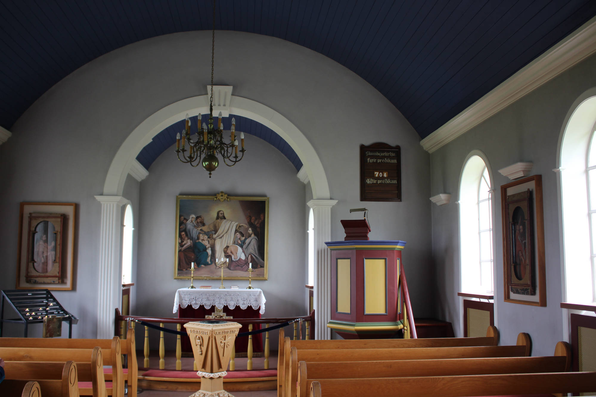Auch von innen ist die 1834 erbaute Víðimýrarkirkja eher schlicht gehalten - ein Hingucker bildet jedoch die Altartafel aus dem Jahr 1616.