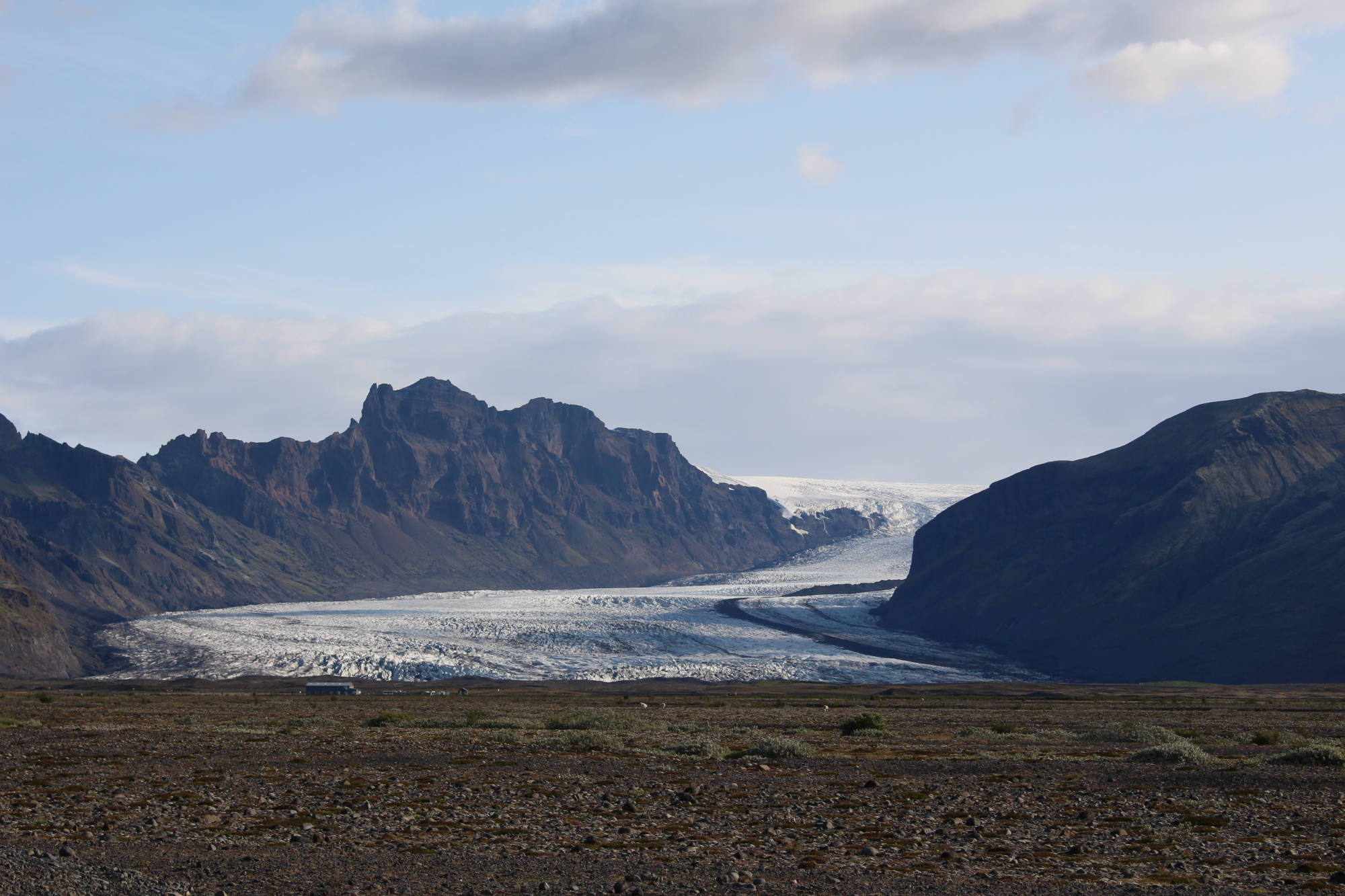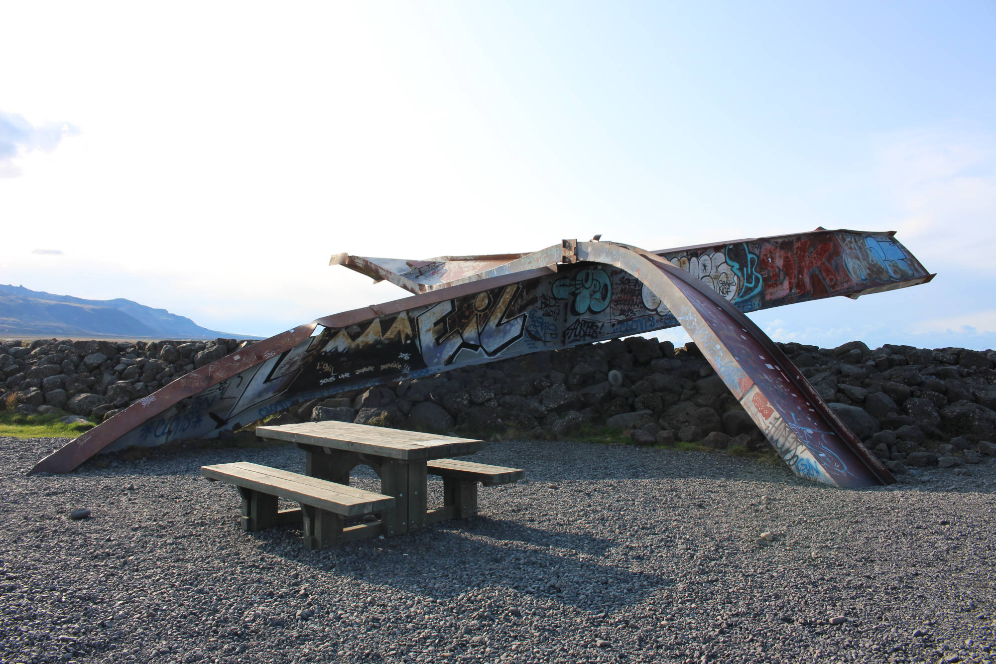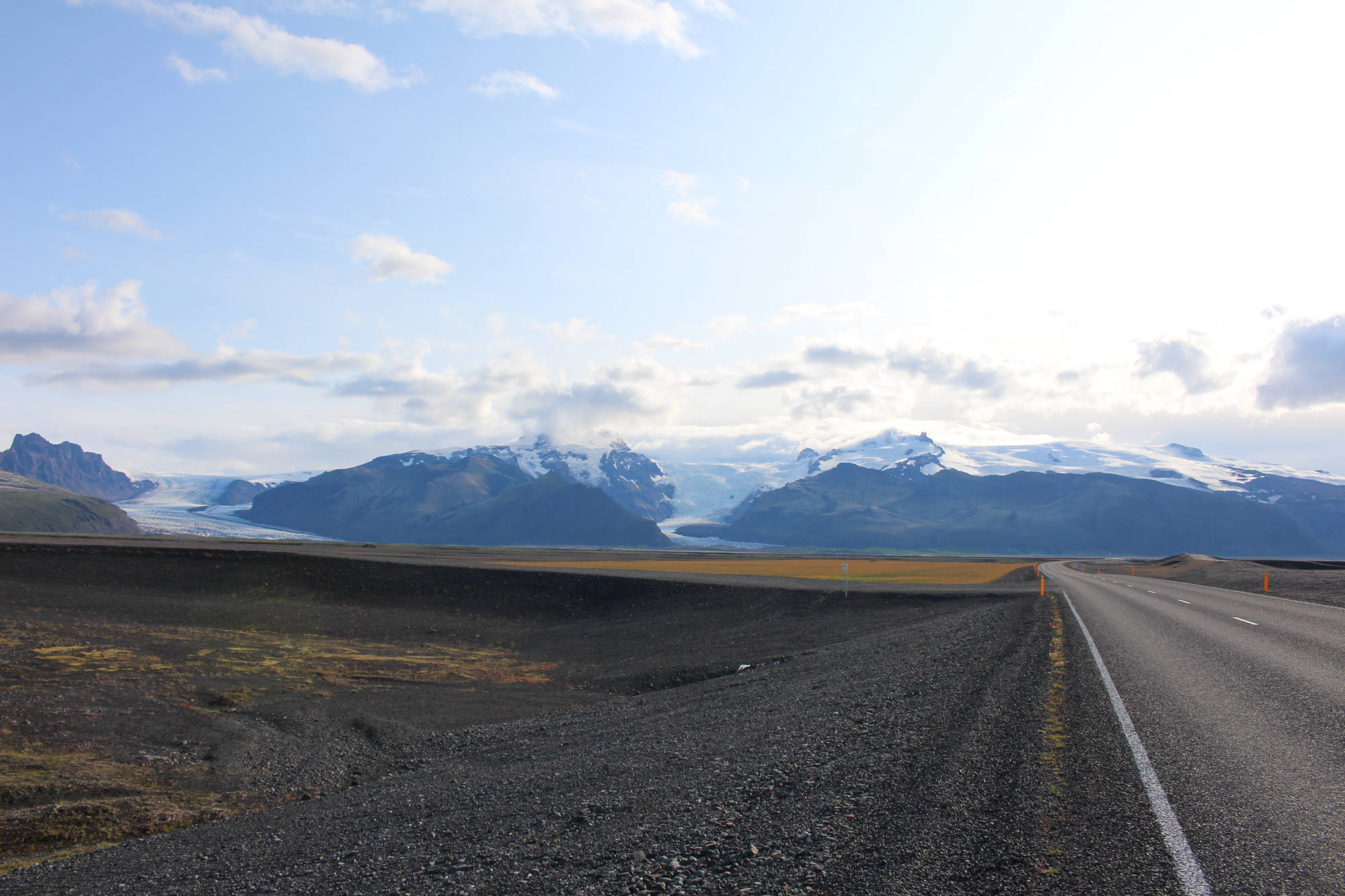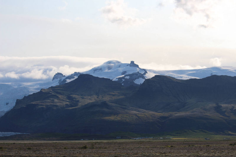 Der Wetterbericht hatte mir ja schon angedeutet, dass heute ein schöner Tag werden könnte, aber dass ich solch ideale Bedingungen zum Radfahren vorfinden würde, hatte ich nicht erwartet. Als ich den Campingplatz in Skaftafell verließ, spürte ich einen leichten Rückenwind. Die Temperaturen befanden sich geschätzt bei etwa 15 °C und die Sonne schien gewillt, diese Zahl noch etwas zu steigern. Als ich auf die Ringstraße einbog, hatte ich eine noch bessere Ausrichtung zum Wind und ich bewegte mich auf der Geraden mit 20 bis 22 km/h. Das hatte ich die gesamte Tour noch nie über eine längere Distanz erlebt. Bald näherte ich mich einer der regelmäßig platzierten Informationstafeln an der Ringstraße. Hinter dieser konnte ich eine Art demolierten Stahlträger erkennen. Ich ahnte, worüber die Texte berichten würden. Zuerst gab es noch ein paar faszinierende Fakten über den Hvannadalshnúkur, den höchsten Berg Islands.