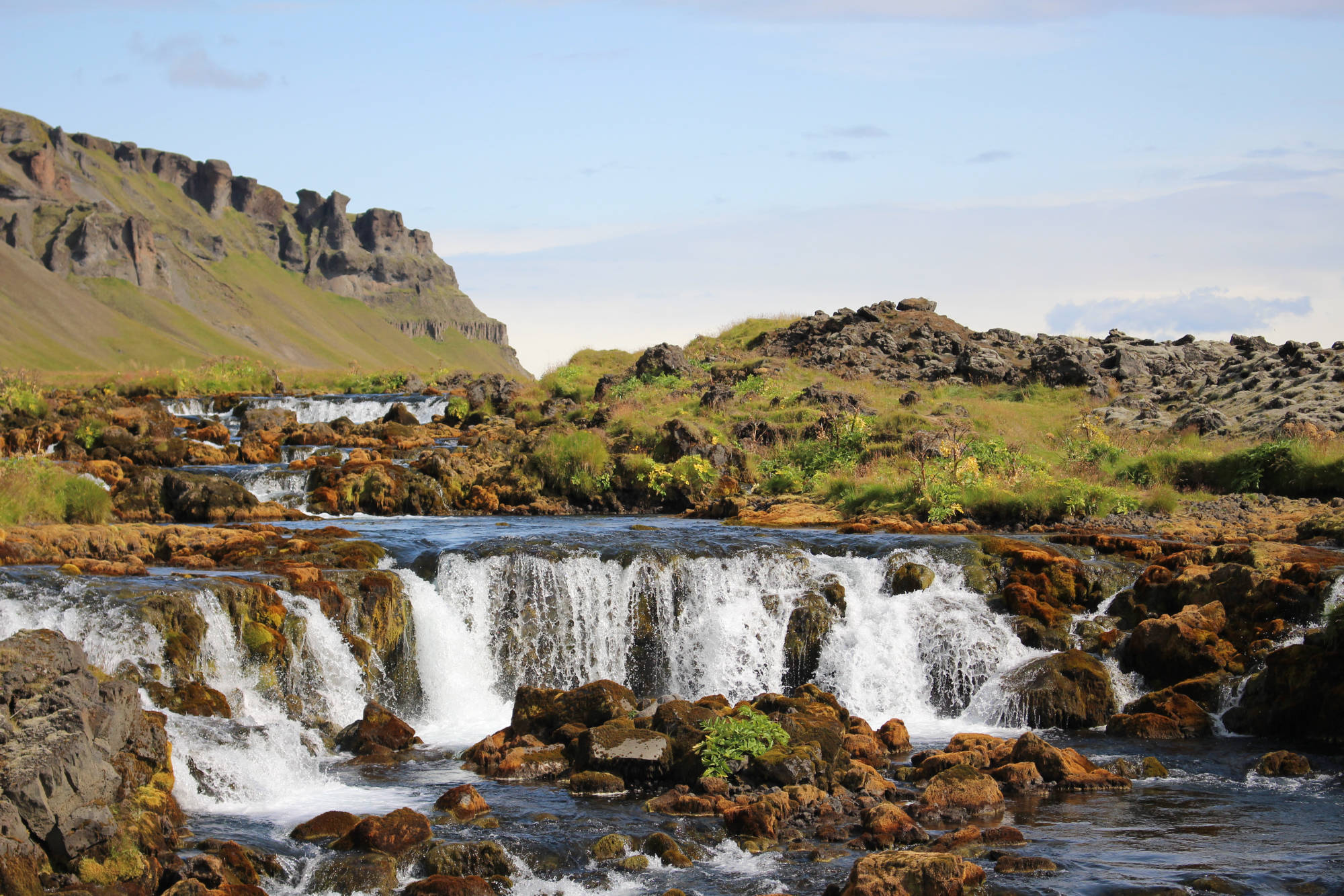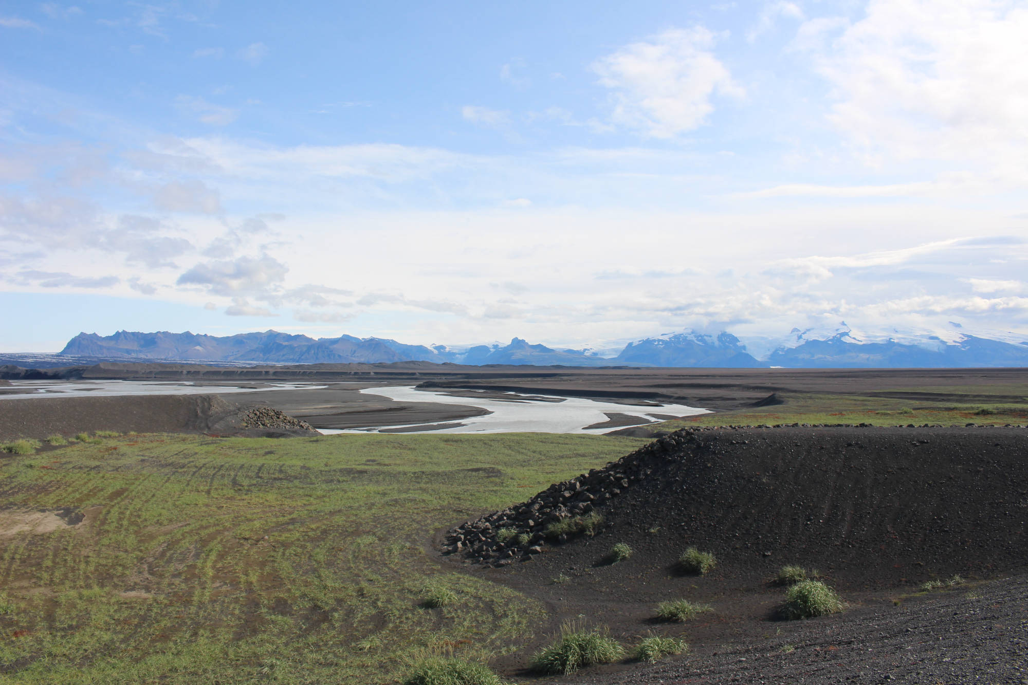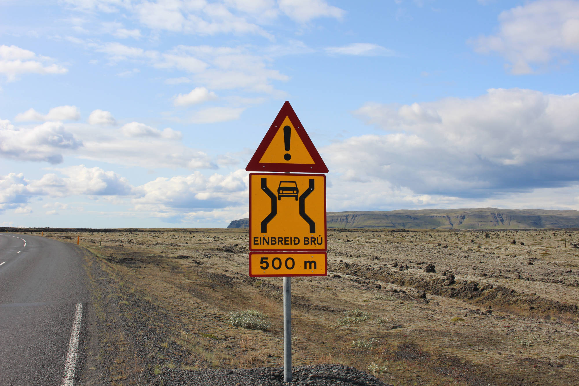Die Ringstraße führte mich weiter durch den Sander über die vielen kleinen Bäche und Flüsse. Die Überquerung dieser erfolgt mittels sogenannter Einbreið brú (einspuriger Brücken), die in Island einmalig sind. Problematisch ist, dass wie der Name sagt, nur ein Auto auf die Brücke passt, was kein Problem wäre, wenn es eine klare Vorfahrtsregel gäbe. Aber es gibt keine. Vermutlich war aufgrund des äußerst spärlichen Verkehrs in der Vergangenheit nie eine Regel nötig. Wie ich erfahren musste, gab es schon einige Unfälle, auch weil die Brücken teilweise schlecht einsehbar sind. Doch in der Regel gibt es keine Schwierigkeiten, weil die meisten Touristen vorsichtig sind. Ich erlebte eigentlich auch deutlich öfter, dass beide Seiten warteten, als dass beide Seiten fuhren.