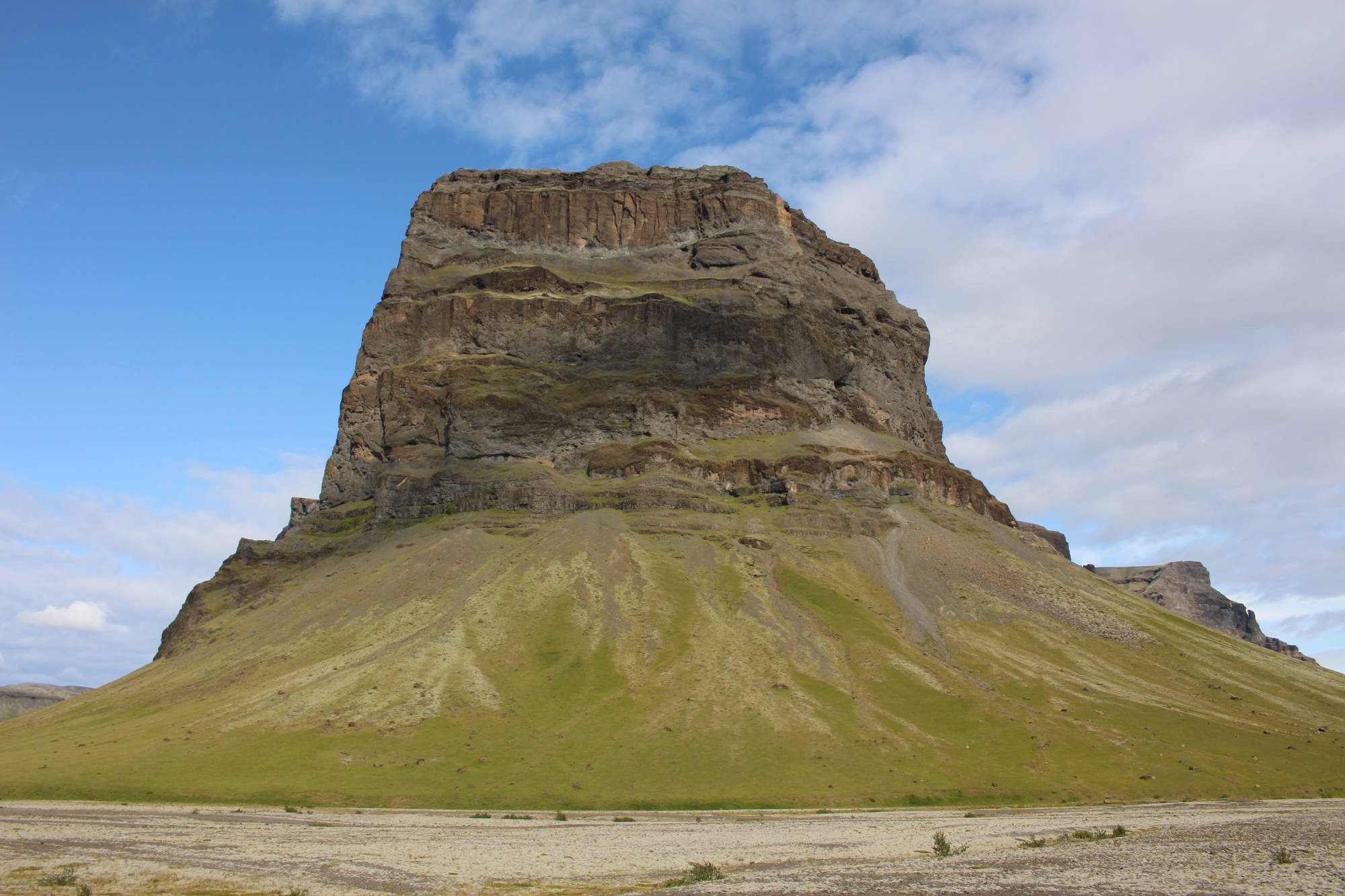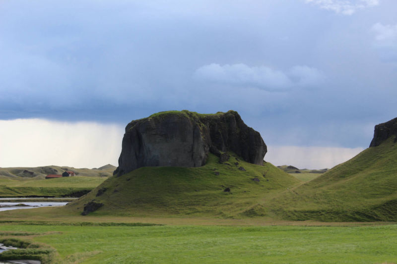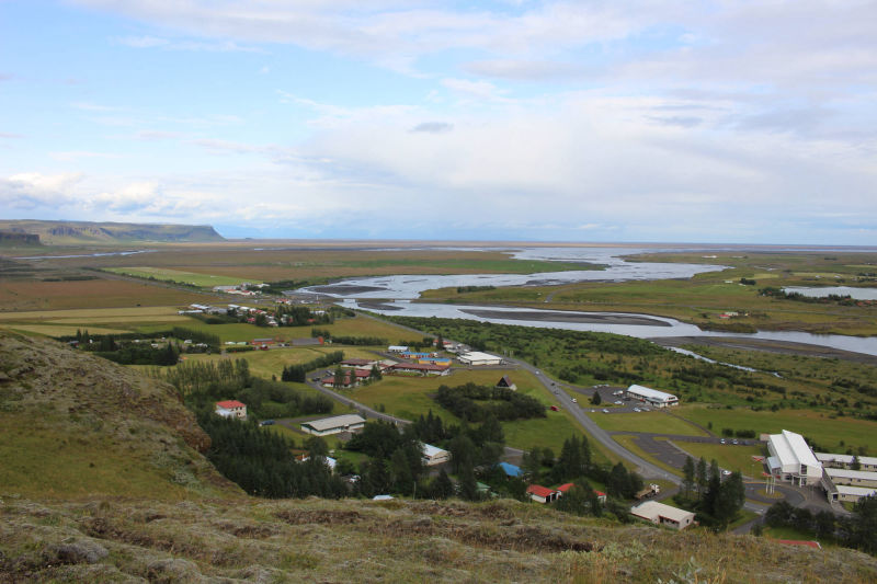 Auch der Vatnajökull war von hier aus wieder gut zu erkennen. Nachdem ich zurück am Fuß des Hügels angekommen war, fuhr ich mit dem Fahrrad noch ein Stück weiter und erreichte einen beinahe zylinderförmigen Felsen, der direkt neben dem Gletscherfluss Skaftá herausragte. Vor fast 250 Jahren bewegte sich hier ein Lavastrom auf Klaustur zu.