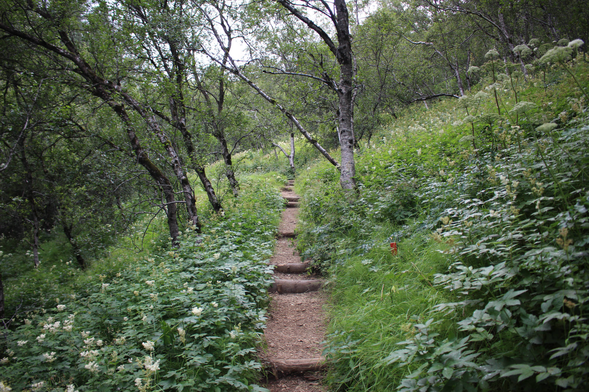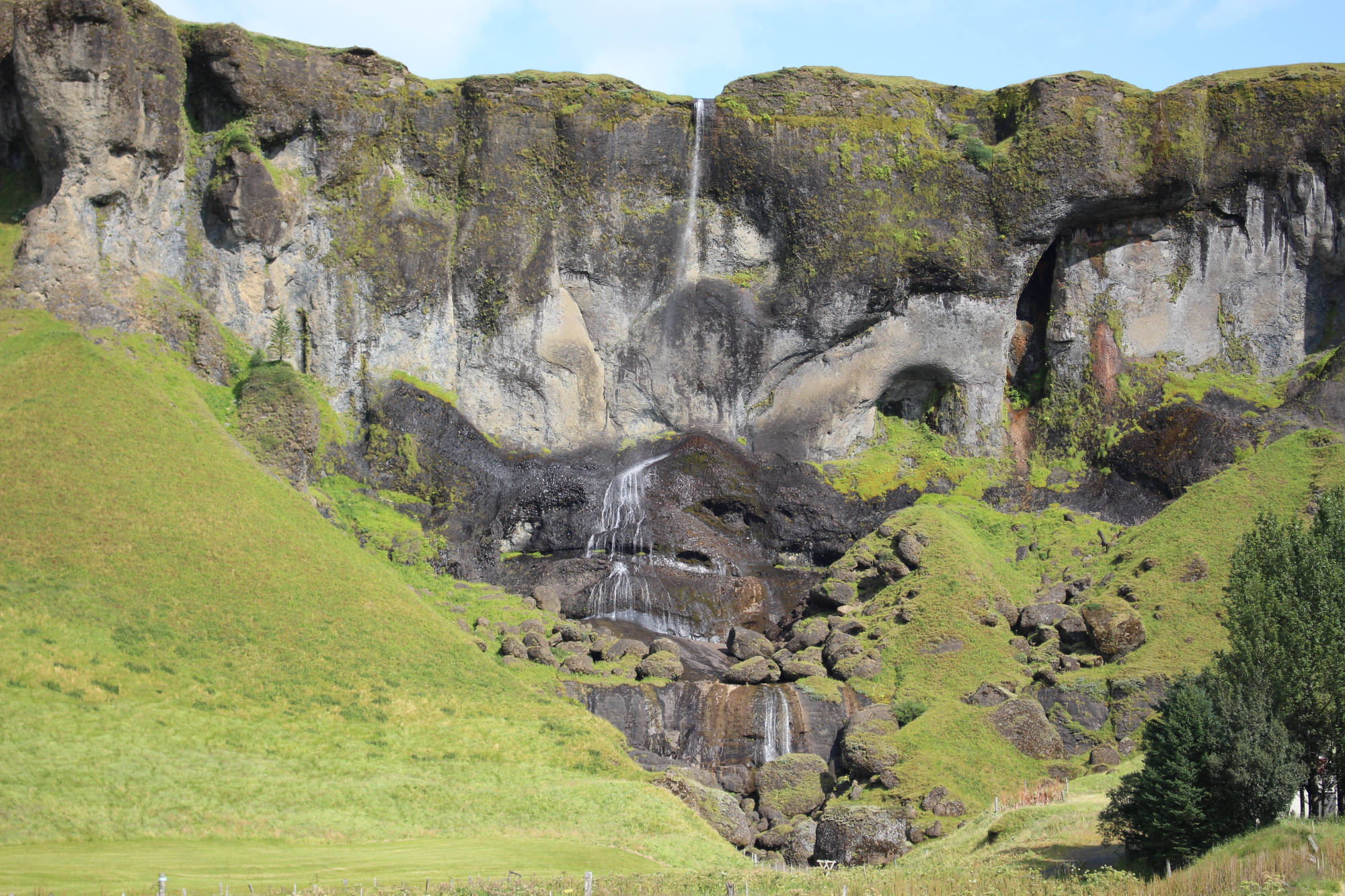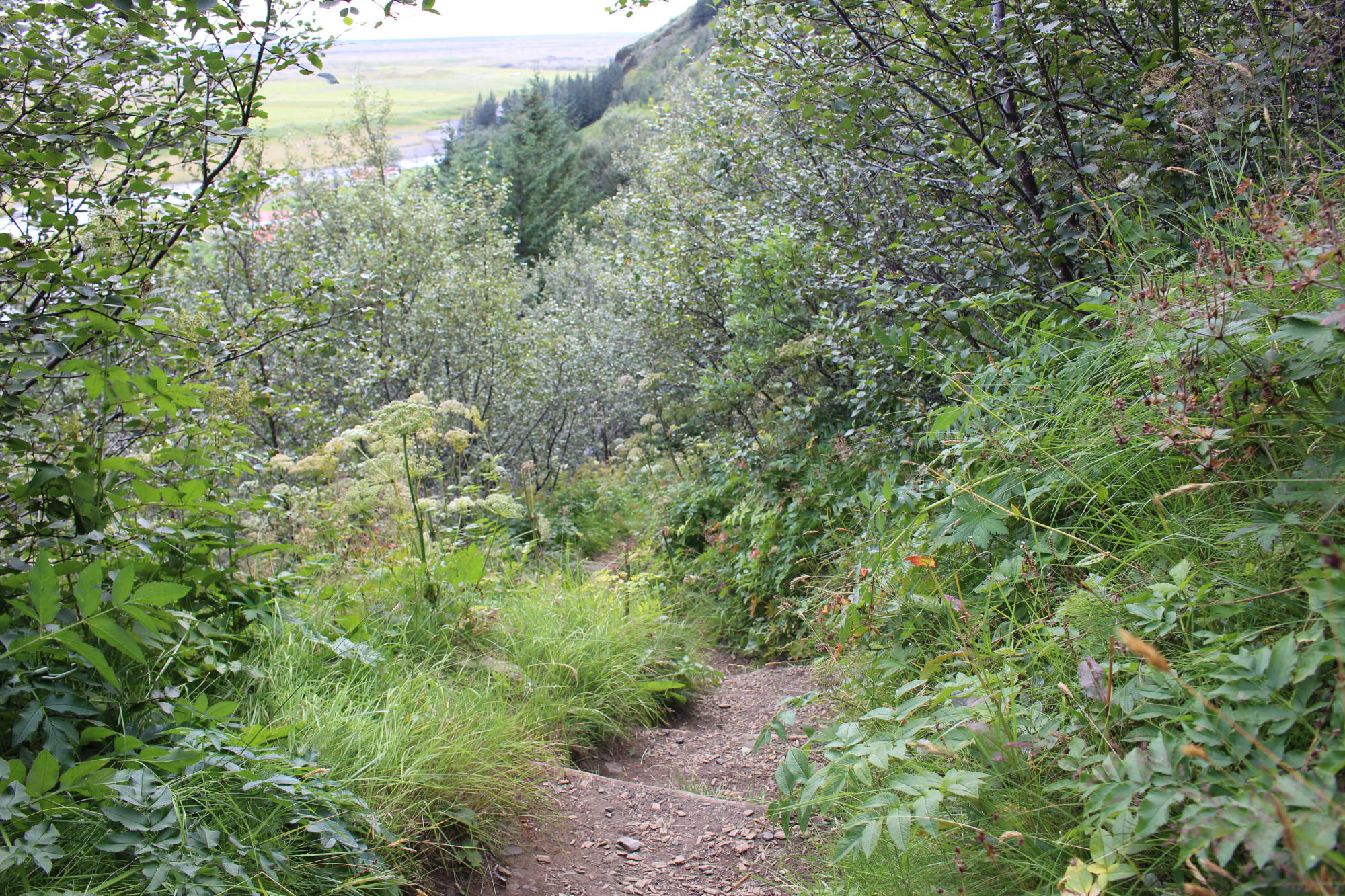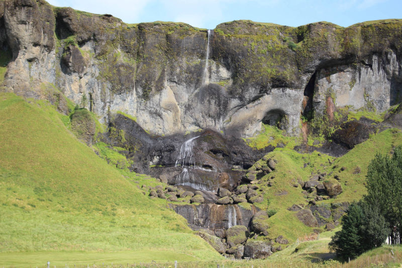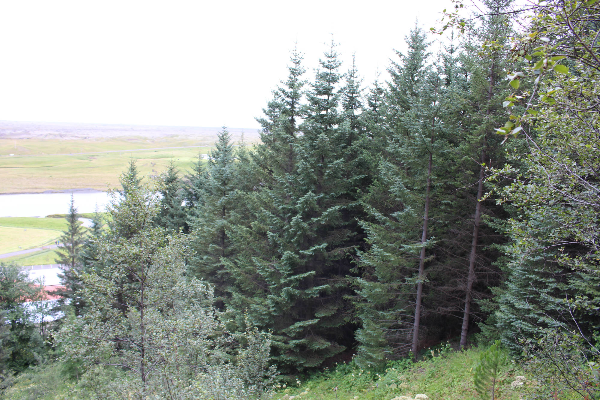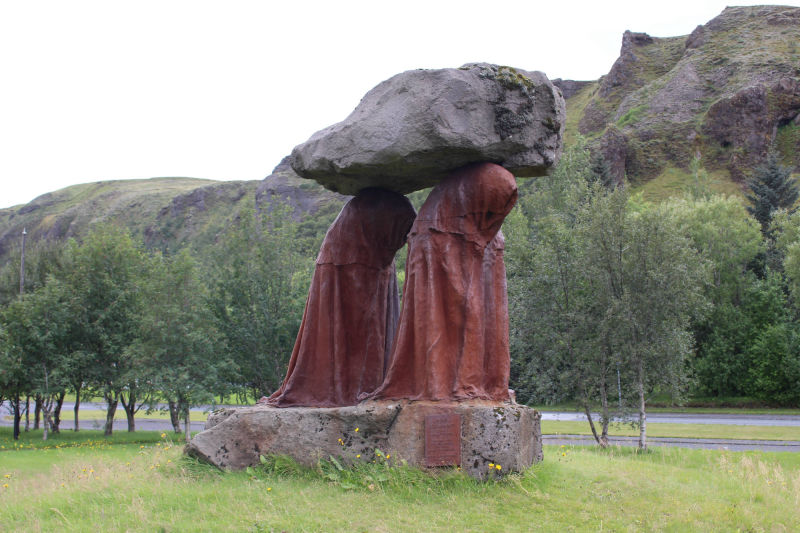 Auch die restliche Etappe blieb der Wind in meinem Rücken und ich genoss dieses Privileg in vollen Zügen. Wie oft hatte ich gegen diesen Wind ankämpfen müssen und jetzt war er auf meiner Seite! Nachdem sich auf meinem Weg noch ein paar schöne Wasserfälle und ein riesiger Felsen namens Lómagnúpur gezeigt hatten, kam ich in Kirkjubæjarklaustur an. Ich fuhr zum Campingplatz und ließ mein Zelt trocknen, dass ich in Skaftafell nach nächtlichem Regen nass hatte einpacken müssen. Dann ließ ich mir mein Mittagessen schmecken und genoss anschließend eine erfrischende Dusche, für die ich das erste Mal isländisches Münzgeld nutzte. Jetzt waren meine Grundbedürfnisse wieder erfüllt und ich konnte mich den Schönheiten der Gegend widmen. Ich folgte mit dem Fahrrad der Hauptstraße des Ortes und kam bald an einem Denkmal vorbei, das zwei Nonnen zeigte, die einen große Felsen trugen. Kirkjubæjarklaustur (Isländer nennen die Stadt auch gerne nur "Klaustur") hat eine lange Geschichte und viele Sagen und Erzählungen ranken sich um diesen Ort. Laut des Landnahmebuches waren die ersten Siedler irische Mönche, die einen Fluch über die Stadt legten: Heiden hätten von nun an in dieser Stadt keine Existenzberechtigung mehr. Hildir Eysteinsson, der keinem Glauben zugehörig war, soll auf der Stelle tot umgefallen sein, als er die Grenzen zur Stadt übertrat. 1186 wurde hier ein Nonnenkloster des Benediktinerordens gegründet und bestand bis zur Reformation. Die Namen der bekannten Sehenswürdigkeiten des Ortes sind auf die Nonnen des Klosters zurückzuführen. Ich folgte dann einem schmalen Wanderweg und erreichte bald einen erstaunlich großen Wald. Zu Beginn war das Aufforsten dieses Gebietes ein Privatprojekt der Familien in Klaustur und der umliegenden Farmen, weil diese Erosionen am Hügel befürchteten und so ihre Grundstücke schützen wollten. 1945 wurde hier die ersten Setzlinge gepflanzt, die sich heute zu großen Birken, Lärchen, Kiefern und Fichten entwickelt haben. 1966 wurde dieser Wald vom isländischen Waldservice übernommen. Heute wächst hier der höchste Baum Islands, der 2016 eine Größe von über 27 Metern vorzuweisen hatte.
