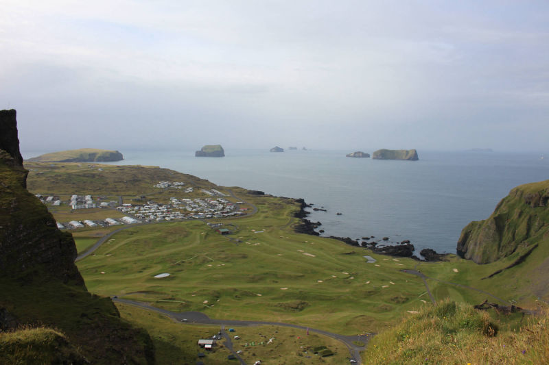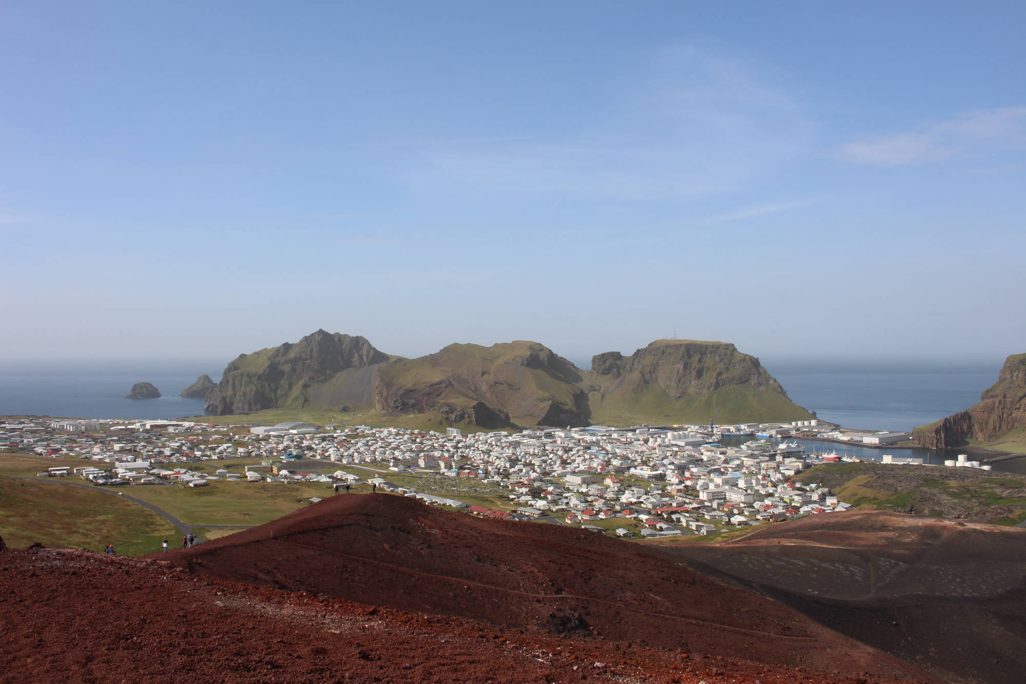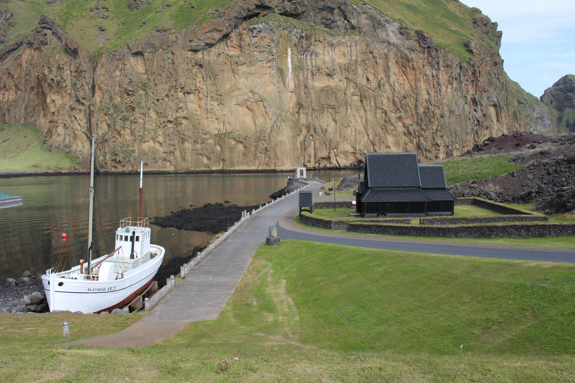 Eigentlich hatte meine Besichtigungstour der Insel schon gestern begonnen, weil ich mein Zelt direkt im Herjólfsdalur aufgestellt hatte. Berichtet wird, dass zu Beginn des 9. Jahrhundert hier der erste Siedler der Westmänner Inseln lebte. Sein Haus sei zudem das erste aus Stein erbaute Gebäude auf ganz Island. 2005 wurde das ehemalige Gebäude rekonstruiert. Wenn man die Hütte betritt und die Holzbänke und -tische betrachtet, hat man tatsächlich das Gefühl ins 9. Jahrhundert einzutauchen. Doch so richtig startete ich gegen 9.00 Uhr. Vorher hatte ich meine Zeit damit verbracht, meine Inselbesichtigung grob zu planen. Dann ging es mit einem morgendlichen Spaziergang los. Dabei sollte das Fahrrad vorerst am Zelt stehen bleiben, denn die zweite Sehenswürdigkeit befand sich direkt neben dem Campingplatz: die beiden Berge Moldi und Háhá. Der steile Anstieg auf den Gipfel hatte den Vorteil, dass ich schon nach kurzer Zeit eine beträchtliche Höhe erreicht hatte und sich mir eine wunderbare Aussicht bot. Auf der einen Seite die Weiten des Meeres mit vereinzelten kleinen Felsen und auf der anderen Seite der Campingplatz sowie der benachbarte Golfplatz. Die vielen beinahe monströsen Felsen machen die kleine Insel einzigartig. Gegen 11.00 Uhr war ich wieder zurück am Zelt und bewegte mich - nun wieder zweirädrig - in die Stadt zum Hafen fort. Dort erkundete ich das Gebiet Skansinn, das den ältesten Teil der Stadt bildet und auf dem unter anderem das zweitälteste Gebäude, Landlyst, steht. Zudem konnte ich hier Reste der englischen Festung aus dem 16. Jahrhundert betrachten. Neben dem Hafen befindet sich außerdem eine Stabkirche, die Island im Jahr 2000 von Norwegen anlässlich der 1000-jährigen Christianisierung geschenkt bekam. Doch dieser Ort stand auch in Verbindung mit dem nächsten spannenden und wohl zugleich tragischsten Punkt auf meiner Inselerkundung: die Geschichte des Vulkanausbruchs 1973. Hier kam bei der Katastrophe vor fast 50 Jahren der Lavastrom zum Stehen.