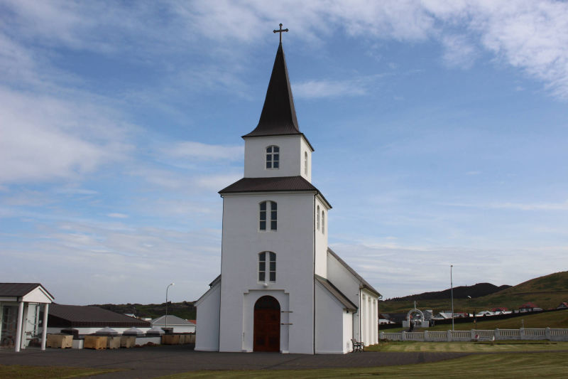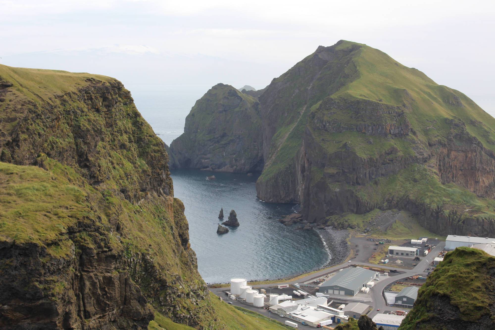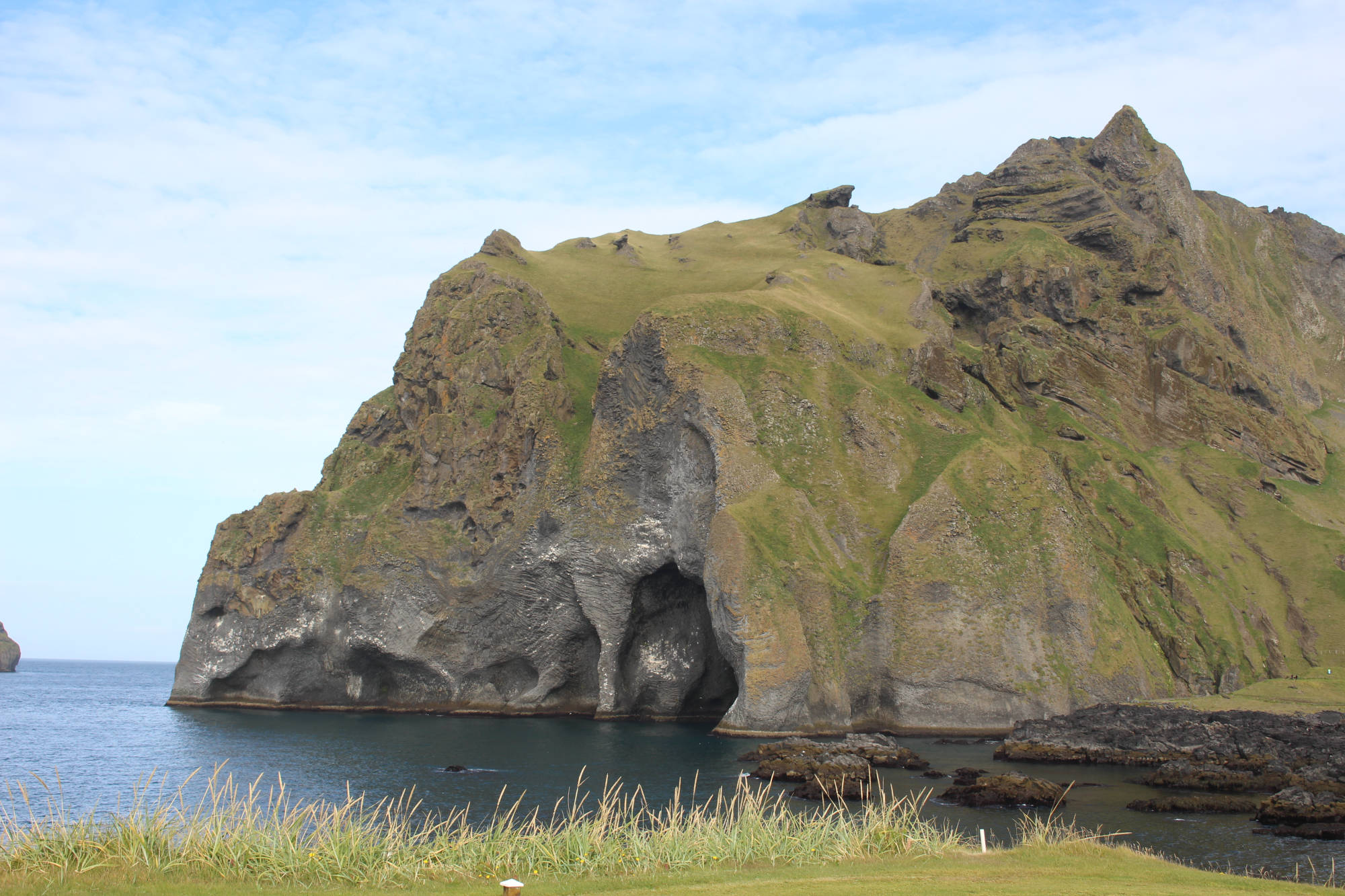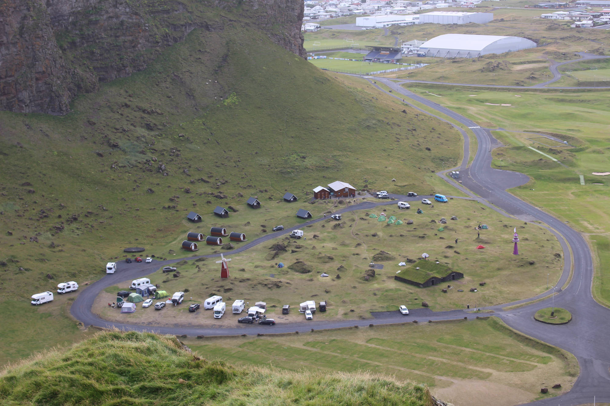 Eigentlich hatte meine Besichtigungstour der Insel schon gestern begonnen, weil ich mein Zelt direkt im Herjólfsdalur aufgestellt hatte. Berichtet wird, dass zu Beginn des 9. Jahrhundert hier der erste Siedler der Westmänner Inseln lebte. Sein Haus sei zudem das erste aus Stein erbaute Gebäude auf ganz Island. 2005 wurde das ehemalige Gebäude rekonstruiert. Wenn man die Hütte betritt und die Holzbänke und -tische betrachtet, hat man tatsächlich das Gefühl ins 9. Jahrhundert einzutauchen. Doch so richtig startete ich gegen 9.00 Uhr. Vorher hatte ich meine Zeit damit verbracht, meine Inselbesichtigung grob zu planen. Dann ging es mit einem morgendlichen Spaziergang los. Dabei sollte das Fahrrad vorerst am Zelt stehen bleiben, denn die zweite Sehenswürdigkeit befand sich direkt neben dem Campingplatz: die beiden Berge Moldi und Háhá. Der steile Anstieg auf den Gipfel hatte den Vorteil, dass ich schon nach kurzer Zeit eine beträchtliche Höhe erreicht hatte und sich mir eine wunderbare Aussicht bot. Auf der einen Seite die Weiten des Meeres mit vereinzelten kleinen Felsen und auf der anderen Seite der Campingplatz sowie der benachbarte Golfplatz. Die vielen beinahe monströsen Felsen machen die kleine Insel einzigartig. Gegen 11.00 Uhr war ich wieder zurück am Zelt und bewegte mich - nun wieder zweirädrig - in die Stadt zum Hafen fort. Dort erkundete ich das Gebiet Skansinn, das den ältesten Teil der Stadt bildet und auf dem unter anderem das zweitälteste Gebäude, Landlyst, steht. Zudem konnte ich hier Reste der englischen Festung aus dem 16. Jahrhundert betrachten. Neben dem Hafen befindet sich außerdem eine Stabkirche, die Island im Jahr 2000 von Norwegen anlässlich der 1000-jährigen Christianisierung geschenkt bekam. Doch dieser Ort stand auch in Verbindung mit dem nächsten spannenden und wohl zugleich tragischsten Punkt auf meiner Inselerkundung: die Geschichte des Vulkanausbruchs 1973. Hier kam bei der Katastrophe vor fast 50 Jahren der Lavastrom zum Stehen.