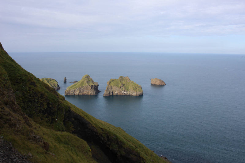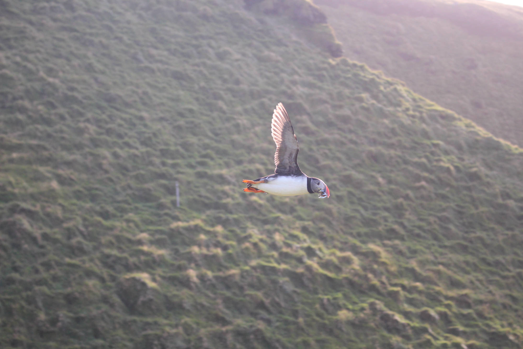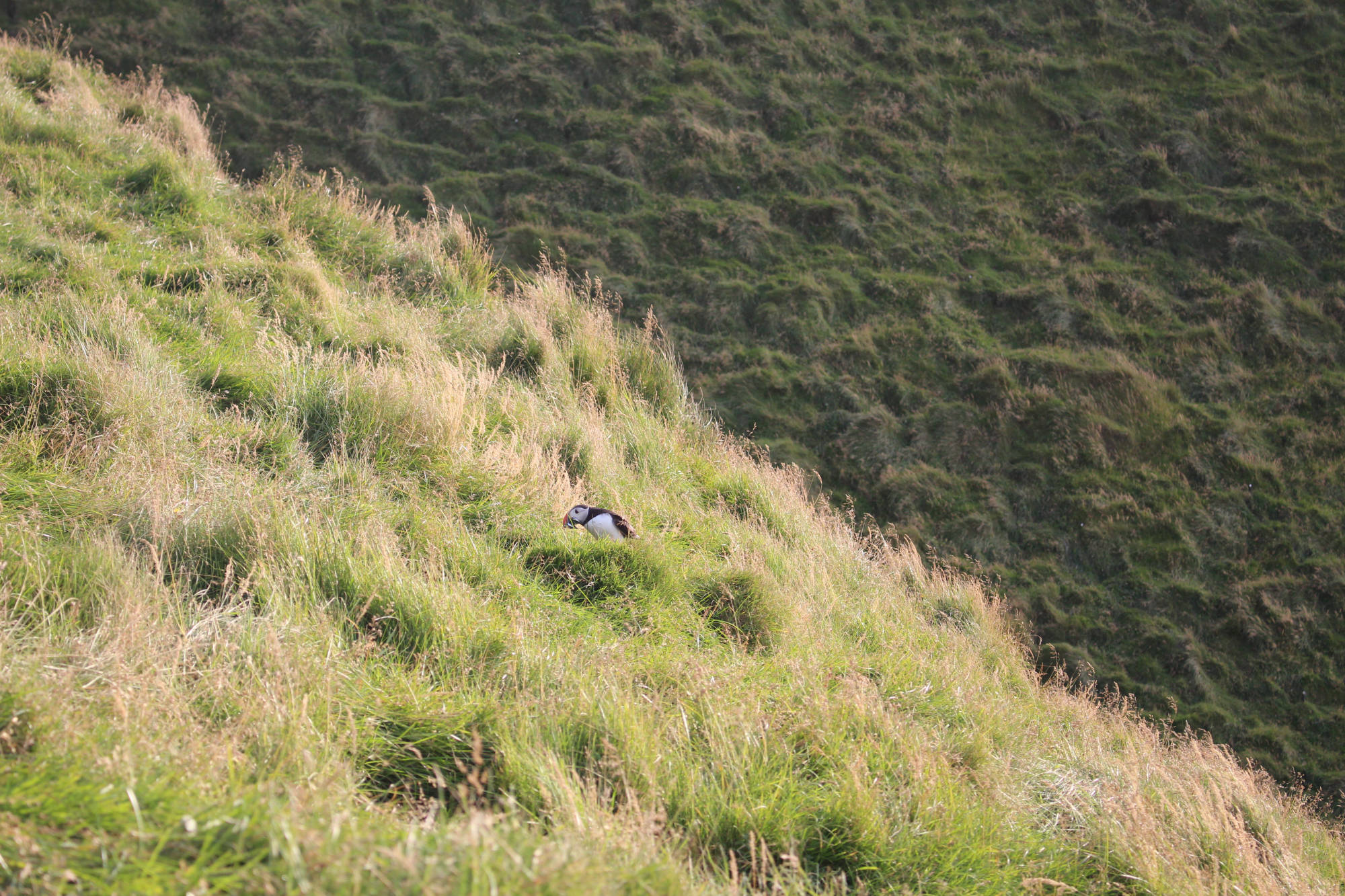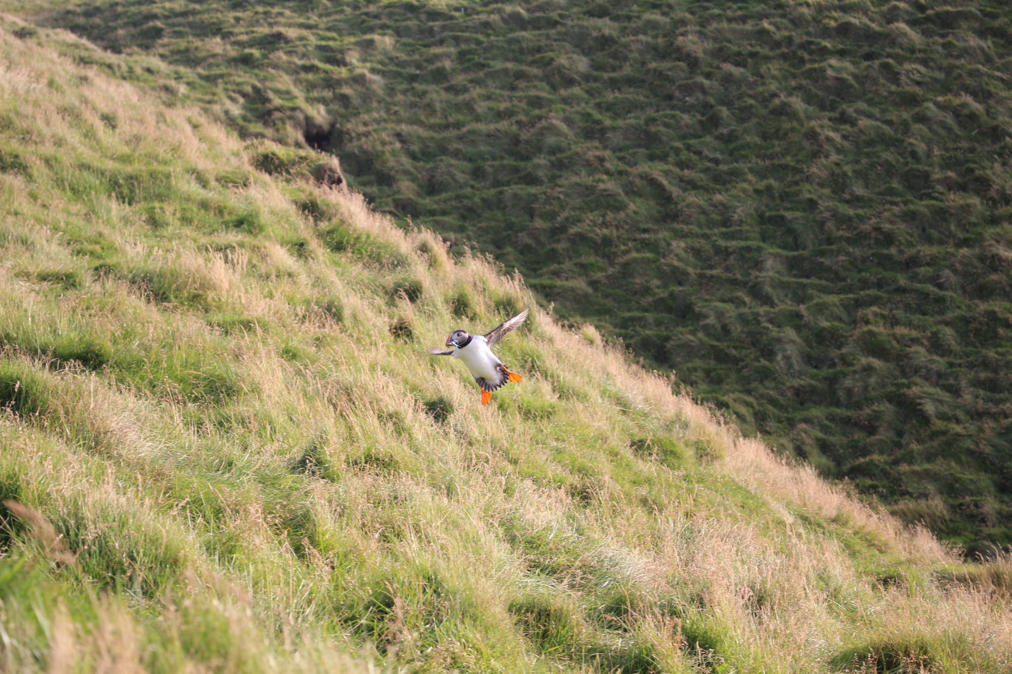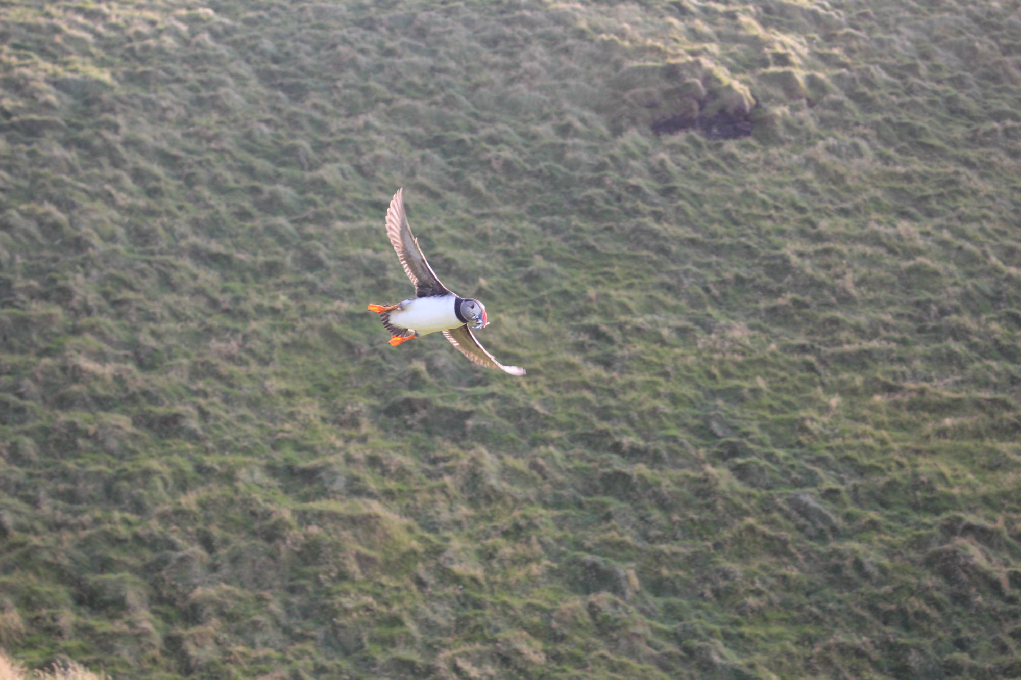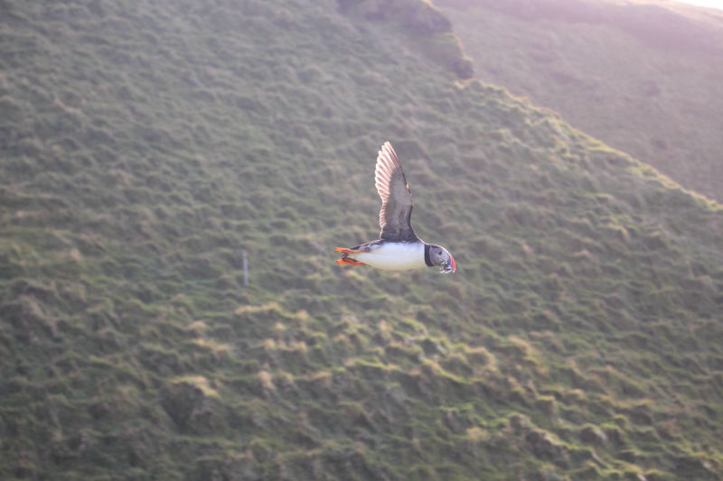 Nach diesen eindrucksvollen Stunden kehrte ich erst einmal zum Campingplatz zurück. Nach einer Stunde Pause setzte ich gegen Abend meine Tour fort und legte 5 Kilometer bis zum südlichsten Punkt der Insel zurück. Das war gar nicht so einfach, denn mittlerweile hatte sich ein starker Nordwind entwickelt. Trotzdem sollte diese letzte Sehenswürdigkeit meinen persönlichen Höhepunkt des Tages bilden. Ich brauchte zwar etwas länger, als gedacht, doch dann erreichte ich den Ort, an dem sich besonders viele Papageitaucher befinden sollten. Und tatsächlich flog ein Vogel nach dem anderen vor meiner Nase entlang. Die meisten der Exemplare hatten gerade Fische im Schnabel. Dieses Spektakel genoss ich eine ganze Weile und schoss dann noch ein paar Fotos von den niedlichen Tieren.