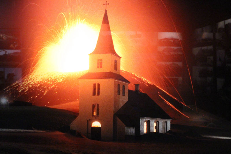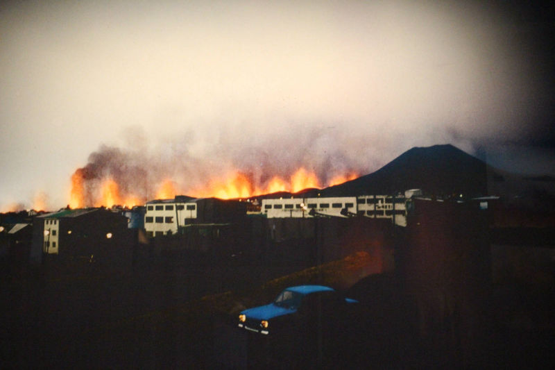 Um 2.00 Uhr morgens am 23. Januar 1973 öffnete sich plötzlich eine rund zwei Kilometer lange Spalte am östlichen Rand der Insel und aus dieser traten gewaltige Lavamengen aus. Bald bewegte sich ein Lavastrom direkt auf die Stadt zu. Glücklicherweise waren in dieser Nacht wegen eines Sturms alle Fischerboote im Hafen geblieben, sodass die Evakuierung der Inselbewohner sofort beginnen konnte. Innerhalb weniger Stunden wurden die fast 5000 Menschen zum rettenden Festland gebracht. Die Bewohner der Insel nahmen das mit, was ihnen gerade in die Hände fiel. Ein Kind flüchtete im Schlafanzug, ein Schüler nahm seinen Schulranzen mit. In den Folgetagen des Ausbruchs wurde die ganze Insel Heimaey unter einer bis zu 160 Meter dicken Schicht Asche begraben. Da der sich der Lavastrom auch Richtung Hafen bewegte, wurden Pläne entwickelt, diesen zu retten. Mit Pumpen wurde kaltes Seewasser genutzt, um die heiße Lava abzukühlen. Nach dem Ausbruch war die Insel um mehr als zwei Quadratkilometer gewachsen, aber nur zwei Drittel der ehemaligen Bevölkerung kamen wieder zurück. Etliche Menschen hatten in dieser einen Nacht ihr gesamtes Hab und Gut verloren. 400 Häuser hatte die Lava unter sich begraben.