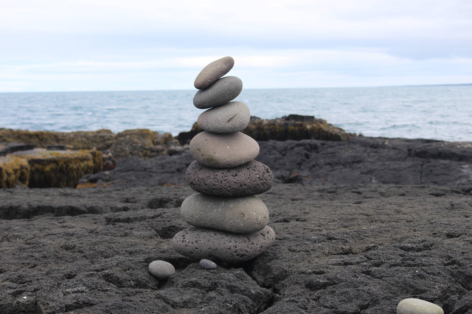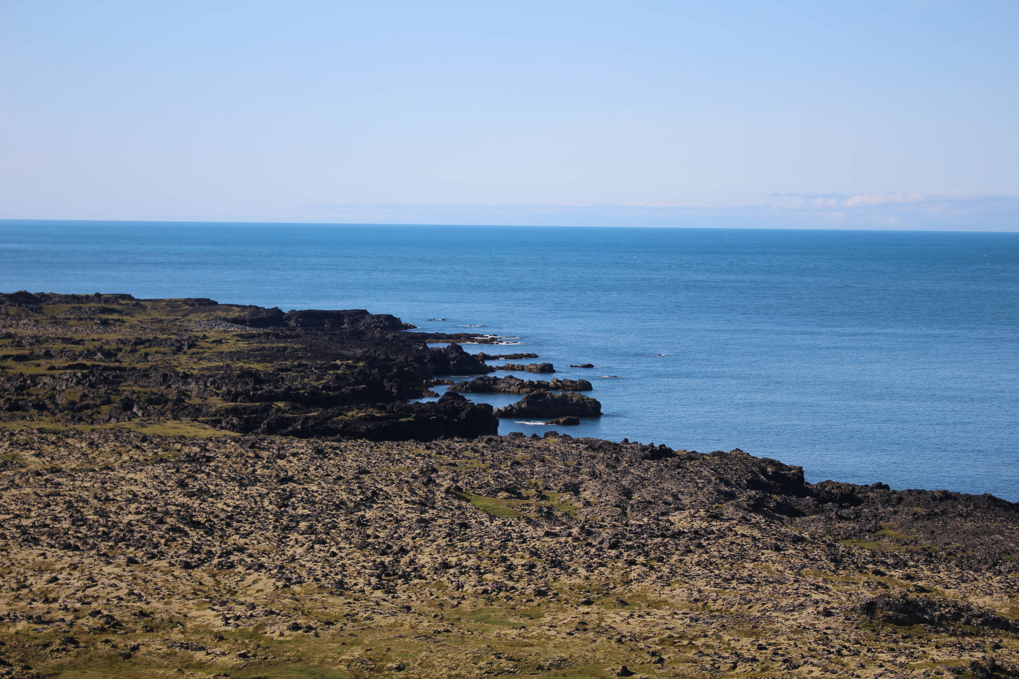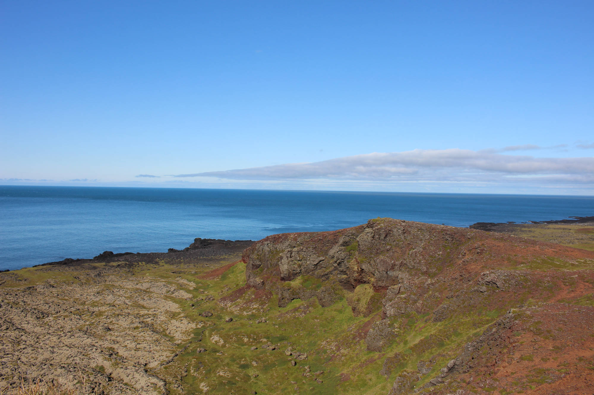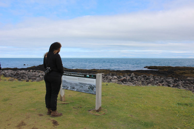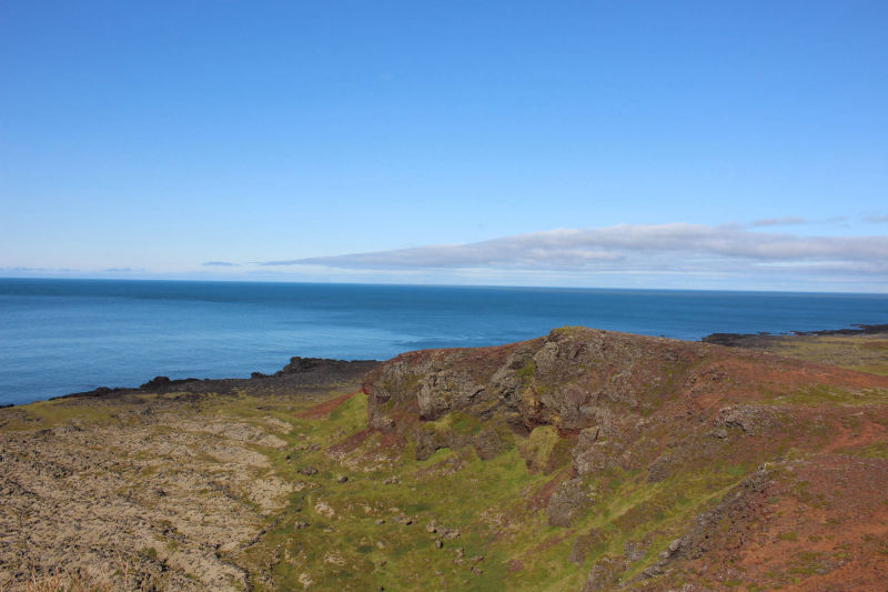 Heute wachte ich mit dem Geruch des Meeres in der Nase und dem Gefühl auf, lange nicht so gut geschlafen zu haben. Die Sonne hatte die nächtliche Kühle aus dem Zelt vertrieben und ich lag kurz einfach nur da und brauchte eine Weile, um wieder zu realisieren, wo ich übernachtet hatte. Kurze Zeit später wachte auch Meta auf und wir beschlossen, sofort das Nachtlager abzubauen, um dann in Ruhe das Frühstück genießen zu können. Der Abbau ging zu zweit recht schnell und dann saßen wir am Holztisch des Rastplatzes und frühstückten im isländischen Sonnenschein. Aufgrund des herrlichen Wetters wollten wir noch einen kleinen Spaziergang zum Meer unternehmen. Der kleine Ausflug verlängerte sich auf etwa eine Stunde, weil wir uns spontan dazu entschieden, einen kleinen Hügel hinaufzusteigen, von dem aus wir uns eine bessere Sicht versprachen. Nach 10-minütigem Aufstieg und deutlich erhöhter Atemfrequenz genossen wir den verbesserten Blick aufs Meer.