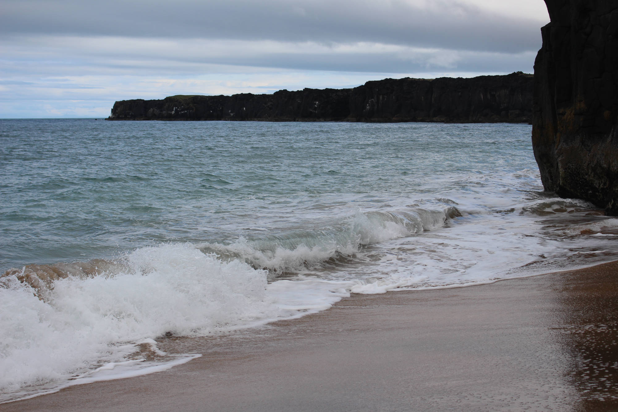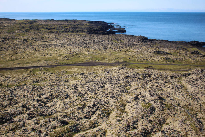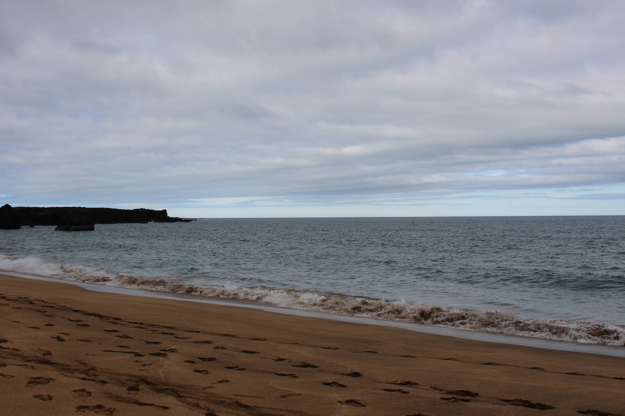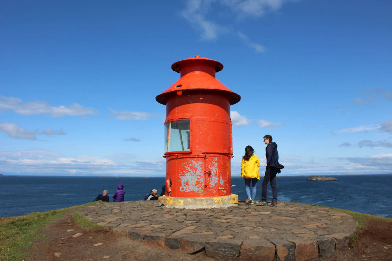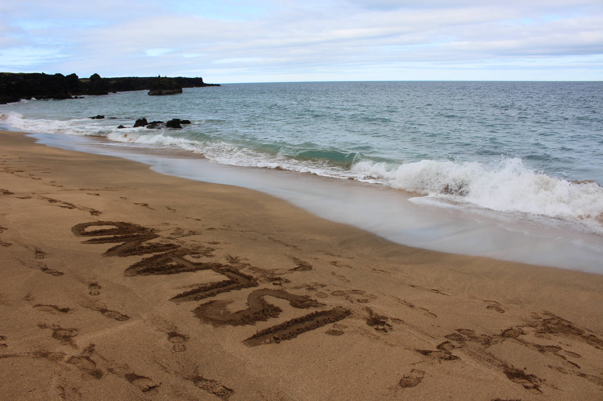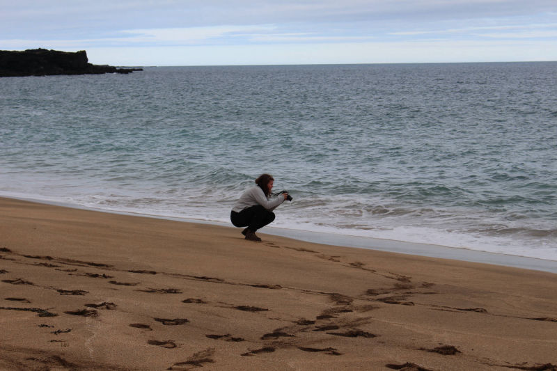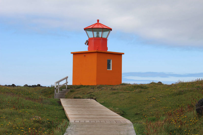 Zurück am Rastplatz angelangt, nahmen wir wieder unsere Plätze im Auto ein und verließen unsere Schlafstätte. Wir fuhren immer weiter in den Snæfellsjökull-Nationalpark und erreichten bald die Abzweigung, die uns zum westlichsten Punkt der Halbinsel führen sollte. Doch vorher begegnete uns ein Sandstrand, der mit seinen Felsen an Teile Frankreichs erinnert. Dort machten wir Halt und erfuhren, dass wir am Skarðsvík-Strand angekommen waren. Unter anderem ist dieser Küstenabschnitt auch berühmter Fundort eines Wikingerskeletts aus dem 10. Jahrhundert. Vom Strand aus konnte man schon den am westlichen Rand der Halbinsel stehenden Leuchtturm entdecken und wir beschlossen, diesen von der Nähe aus zu betrachten. Doch der Weg dahin war beschwerlich: eine Schotterstraße, die mehr an eine Kraterlandschaft erinnerte als an eine Straße. Wir kamen nur sehr langsam voran, aber erreichten letztendlich glücklich den Leuchtturm. Wir staunten nicht schlecht, als uns am Ende der Straße ein großer Reisebus entgegenkam. Meta und ich stellten uns eine Frage: Wie in aller Welt hatte dieser Bus es bis hierher geschafft?!