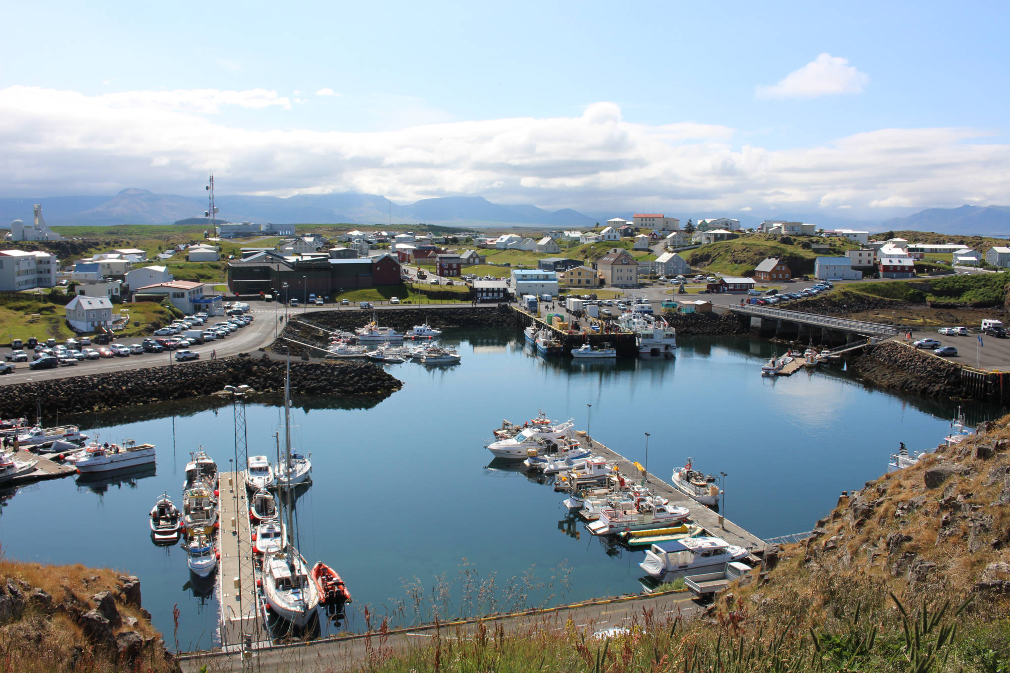 Zum Hafen von Stykkishólmur gehört die Insel Súgandisey, die zu Fuß zu erreichen ist und einen herrlichen Blick über das Meer bietet. Während die alten Kirchen Islands eher durch Schlichtheit glänzen, sind die modernen isländischen Kirchen, welche teils sehr ungewöhnliche Formen aufweisen, immer ein Blickfang. So ist auch die Kirche in Stykkishólmur ein Hingucker. Stykkishólmur sollte unser letzter Zwischenstopp sein.
