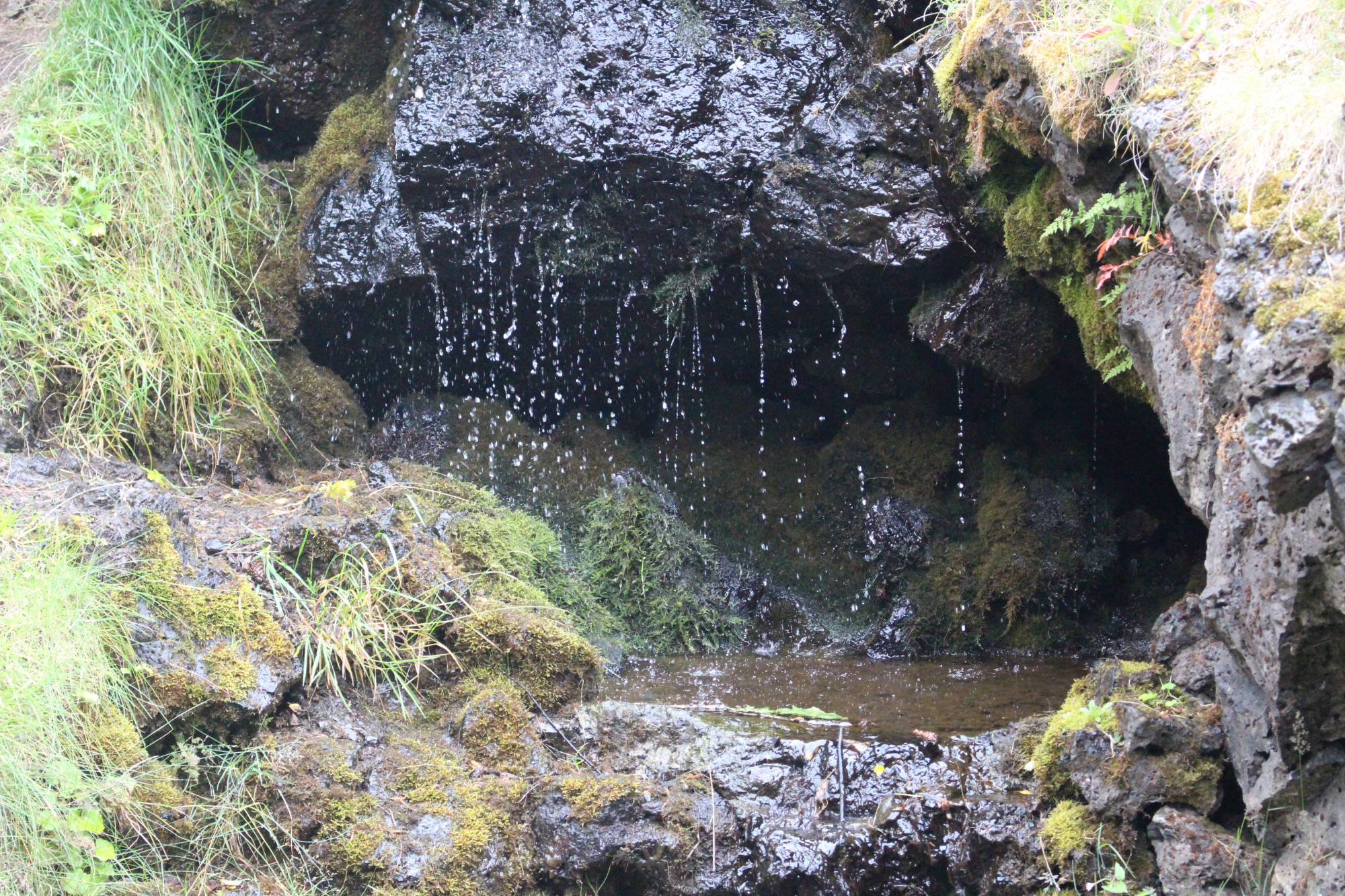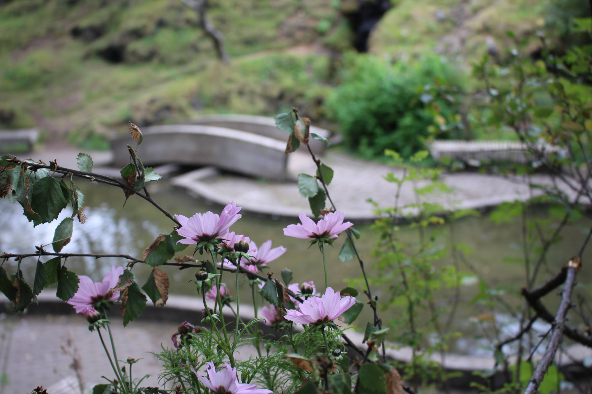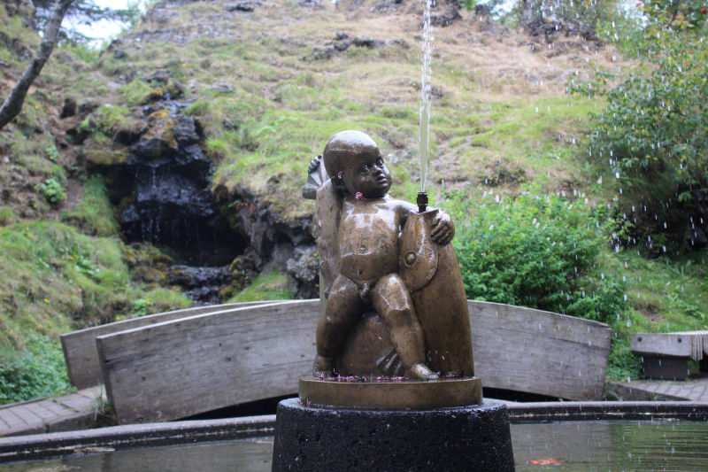 Denn berühmt ist Hafnarfjörður vor allem für das rund 8000 Jahre alte Lavafeld, auf dem die Stadt erbaut wurde sowie für die märchenhaften Bewohner dieses Lavagebietes. Die Seherin und sogenannte "Elfenbeauftragte" Erla Stefánsdóttir behauptet, schon seit ihrer Kindheit Kontakt zu Feen, Elfen, Trollen und Zwergen zu haben. Sie entwickelte sogar eine Karte von Hafnarfjörður, auf der sie die Lage der Häuser und Burgern des versteckten Volkes in Lavahöhlen und -hügeln gekennzeichnet hat. Nach einem Besuch des Stadtparks Hellisgerði könnte man jedoch tatsächlich von der Existenz der fantastischen Wesen überzeugt werden. Wenn sich Trolle und Elfen hier nicht wohlfühlen, wo dann? Sobald man das Tor zu diesem Stadtpark durchschreitet, vergisst man, sich in einer Stadt zu befinden. Die Unebenheiten aufgrund der Lavahügel sorgen nicht für eine klassische Stadtparkidylle, sondern lassen eine mystische, märchenhafte Stimmung aufkommen. Die niedrigen Bäume strecken ihre dicken Wurzeln über die schmalen Wege und Treppen. Hier und da musste ich ein paar Äste und Zweige zur Seite biegen, um mir meinen weiteren Weg zu ermöglichen. In der Mitte des Parks angekommen, zeigte sich mir ein kleinerer Brunnen mit einer goldenen Skulptur in dessen Mitte. Gespeist wurde dieser Brunnen von einem winzigen Wasserfall, der sich seinen Weg hinab von einem kleinen Hügel bahnte. Umringt wurde dieses Szenario von den vielen violetten Blumen, die wahrscheinlich von den Elfen höchstpersönlich gepflanzt wurden.