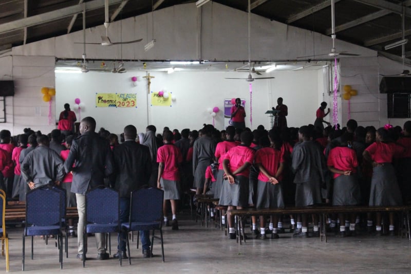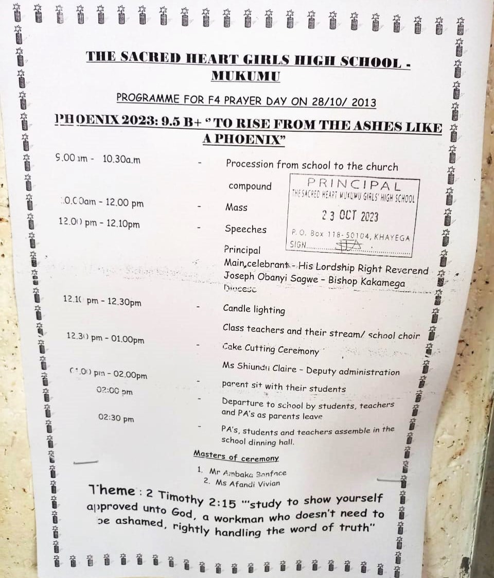 Ich habe mich lange nicht mehr so sehr in meine Abiturzeit zurückgesetzt gefühlt wie am heutigen Tag. "Prayer Day" (Gebetstag) ist eine Art Abschlussveranstaltung der Schulzeit in der weiterführenden Schule. Anders als in Deutschland findet die Veranstaltung aber vor den Prüfungen statt, da der Zweck der Veranstaltung das Beten für die Prüflinge und gute Ergebnisse ist. Das Motto für den Tag (und das komplette Abschlussprogramm): "Wie Phönix aus der Asche" hat einen gewissen Hintergrund. Die Schule in Mukumu hat im Jahr 2023 einige Schwierigkeiten erleben müssen. Unter anderem ist ein Feuer in einem der Gebäude ausgebrochen und viele Schülerinnen haben all ihre Schulsachen verloren. Deshalb entschieden sich die Schülerinnen für dieses Motto. Außerdem wird für jede Abschlussklasse ein Notendurchschnitt festgelegt, der angestrebt wird. Hier in Kenia wird das britische Notensystem genutzt, dass von der Bestnote A bis zum schlechtesten Note E reicht. Diese Noten entsprechen den Punkten von 12 bis 1. In diesem Jahr soll der gesamte Jahrgang einen Durchschnitt von B+ (9.6 oder mehr) erreichen.