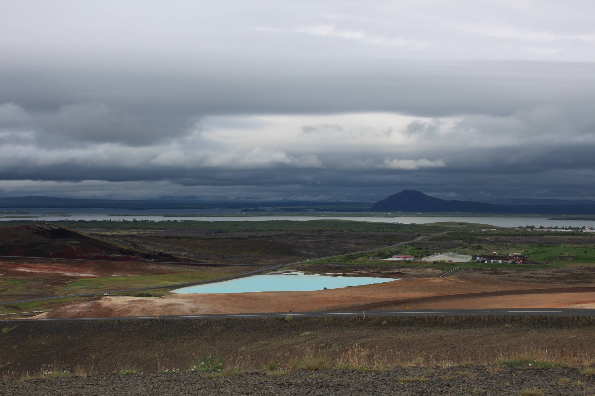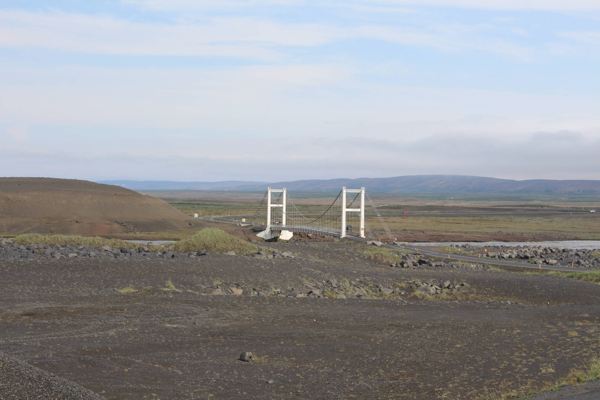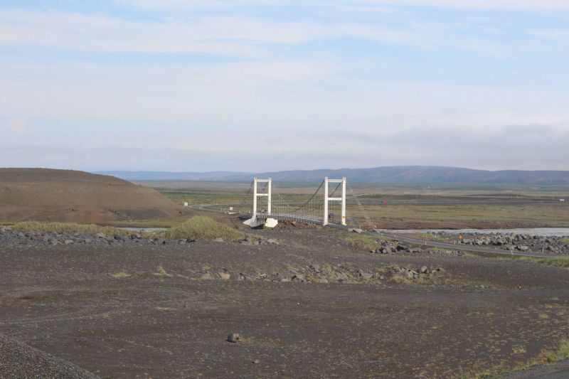 "Es ist egal, ob man die Insel im Uhrzeigersinn oder andersherum umrundet, man hat immer Wind." So oder so ähnlich hatte ich es bei meinen Vorbereitungen auf die Tour gelesen und heute spürte ich, wie wahr dieser Satz doch ist. Auf meinem Weg nach Grímsstaðir begleitete mich ein beständiger Gegenwind. Er war zwar nicht so stark, dass ich aufgeben wollte, aber er kostete mich eine Menge Kraft. Glücklicherweise sollte die heutige Etappe nur 40 Kilometer betragen und dementsprechend war es nicht schlimm, dass ich nur langsam vorankam. Die ersten 5 Kilometer führten mich über einen 417 Meter hohen Berg, dessen Anstieg recht steil verlief. Somit hieß es hier "kurz und schmerzlos" den Berg zu bezwingen. Der Ausblick war herrlich. Ich konnte die ganze Umgebung um den See betrachten. Auch an den Ausblick vom Fahrrad während der Fahrt werde ich mich nie gewöhnen. Die recht flache Umgebung hinter dem Berg ließ einen weiten Blick in die Ferne zu. Neben mir erstreckten sich Lavafelder und ab und zu fuhr ich an Bergen oder Kratern vorbei. Kurz vor meinem Ziel überquerte ich die "Golden Gate Bridge des Hochlands" und war beeindruckt von den reißenden Strömen, die sich unter der Brücke ihren Weg bahnten. Als ich auf den Weg zum Campingplatz abbog, sah ich schon das Schotterstraßen-Warnschild und bereitete mich auf die kommenden Strapazen vor. Die Straßenqualität nahm tatsächlich deutlich ab und ich versuchte den vielen Schlaglöchern auszuweichen. Der noch verstärkte Gegenwind sorgte nicht gerade für eine Verbesserung der Situation. Das waren wohl die 4 anstrengendsten Kilometer der gesamten bisherigen Tour. Ich erreichte den Campingplatz und mich überkam das Gefühl, am Ende der Welt angelangt zu sein. Zum einen waren keinerlei andere Camper zu sehen (was aber auch an meiner Ankunftszeit 13:30 Uhr lag), zum anderen bestand dieser Campingplatz aus einer Wiese mit einem Plumpsklo. Aber es stellte sich heraus, dass genau diese verlassene Gegend und deren Ruhe das Richtige für mich waren. Ich stellte mein Zelt auf, was sich bei dem Wind recht schwierig gestaltete, und legte mich auf meine Isomatte. Innerhalb der nächsten zwei Minuten war ich eingeschlafen und wachte erst 16.00 Uhr wieder auf. Anscheinend hatte mein Körper den Schlaf wirklich nötig.