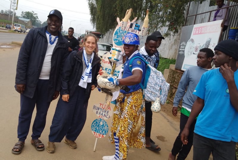 Am Fuß des Ranges tanzte eine Gruppe von Fans. Rael erklärte mir, dass es sich um einen bestimmten Tanz der Luhyas (einer der Stämme in Kenia, die um Kakamega angesiedelt sind), namens Isokuti, handelt. Auch die Fangesänge sind typische Gesänge aus der Luhya-Kultur. Am auffälligsten war ein Mann, der einen Helm trug, an dem zwei Maiskolben befestigt waren. Außerdem trug er eine (lebendige) Henne mit sich herum und an seinem Zepter waren zwei Packen Maismehl befestigt. So vereinigte er die "Wahrzeichen" der Luhyas und feuerte die Menge beim Tanzen an.